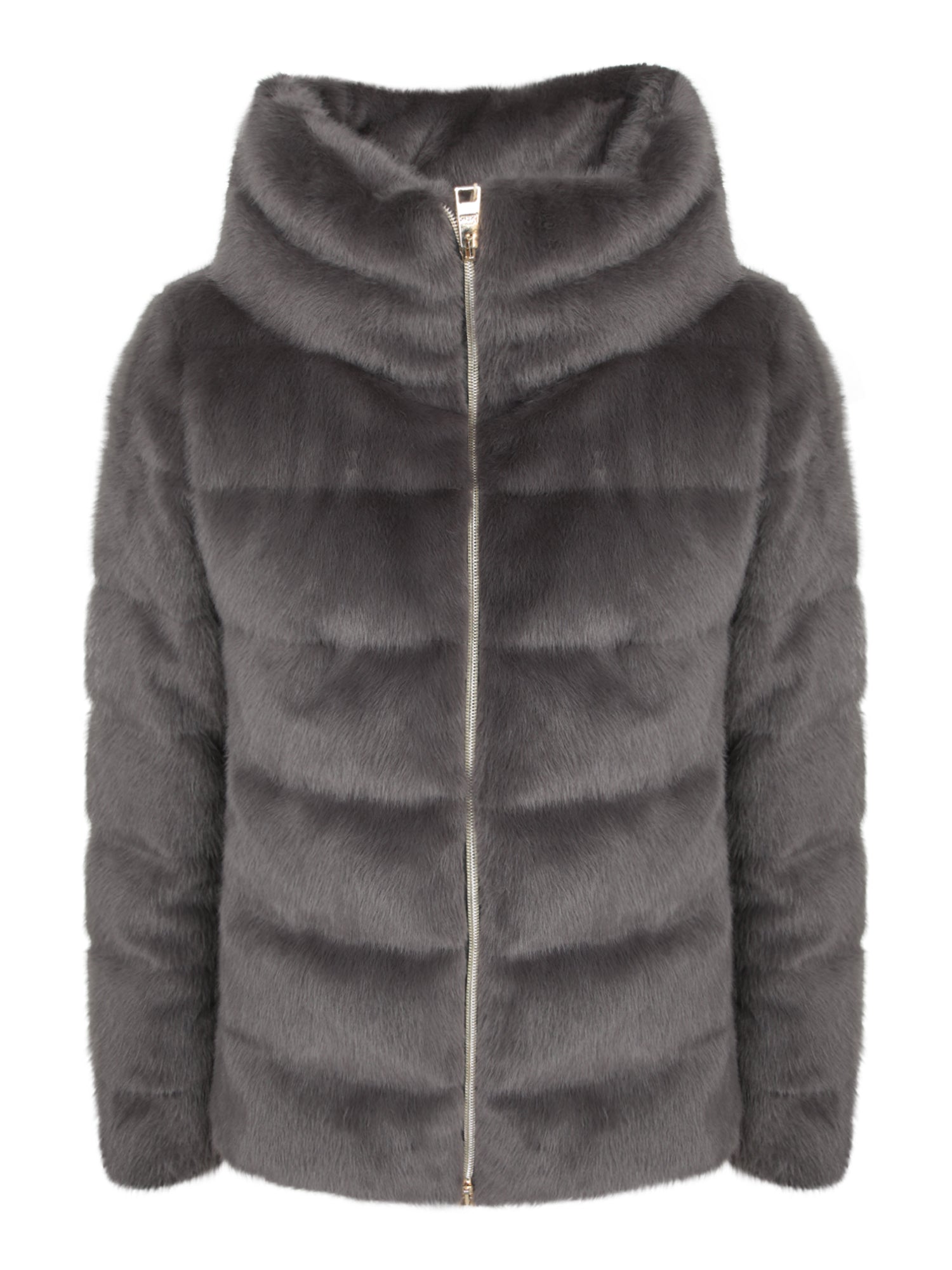 Short faux fur jacket with central zipper and high collar.
