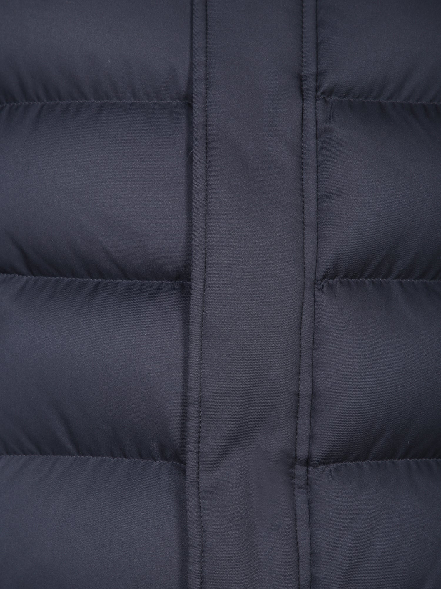 Padded puffer jacket, high collar with faux fur interior, front zip closure.