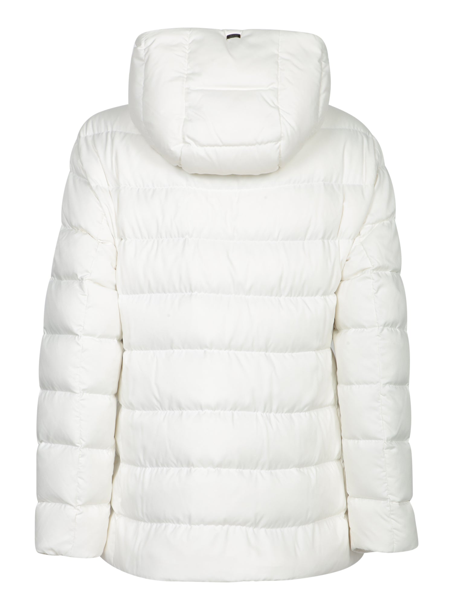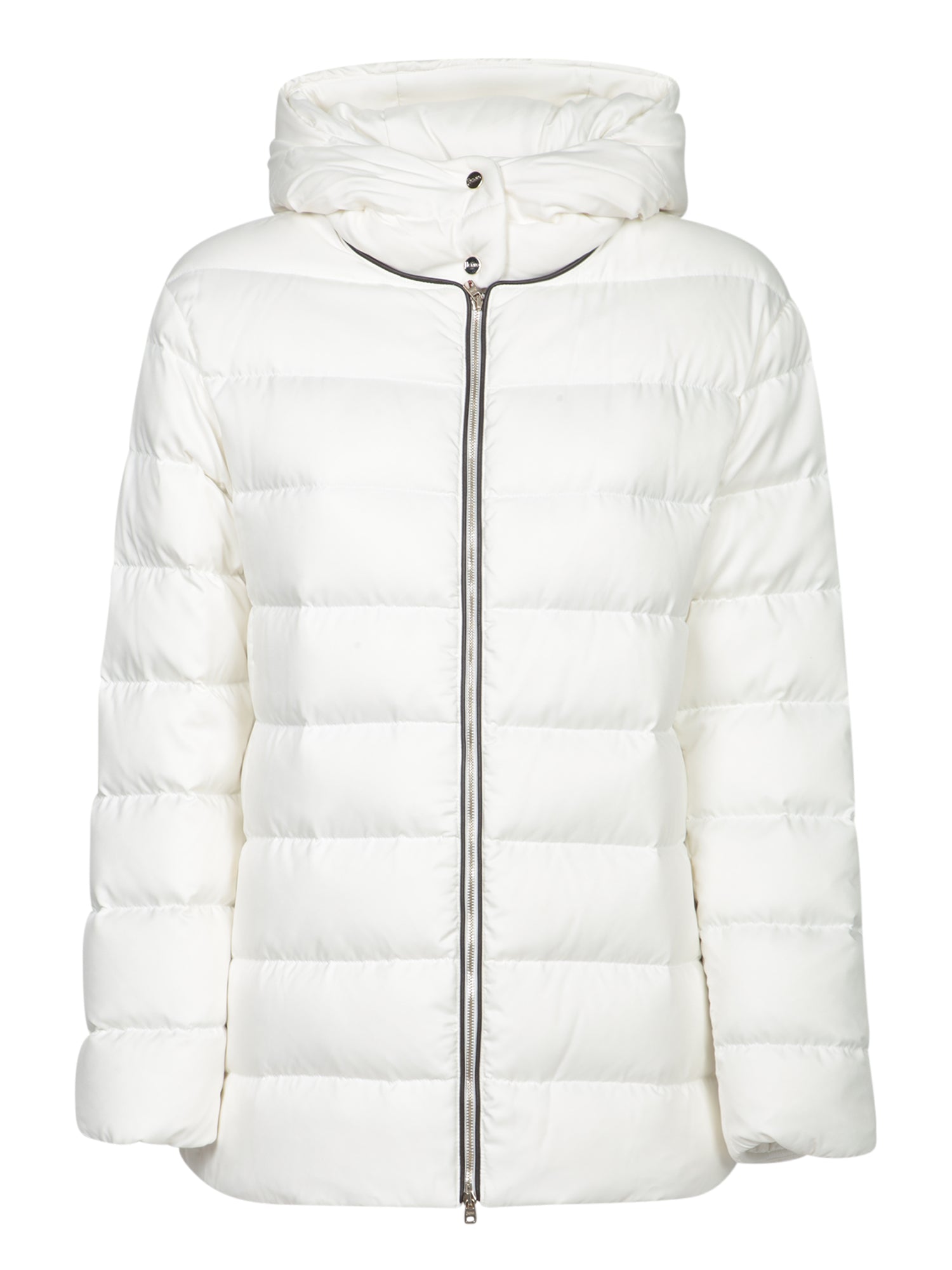 Padded jacket with wraparound hood, front zip closure, invisible side pockets.