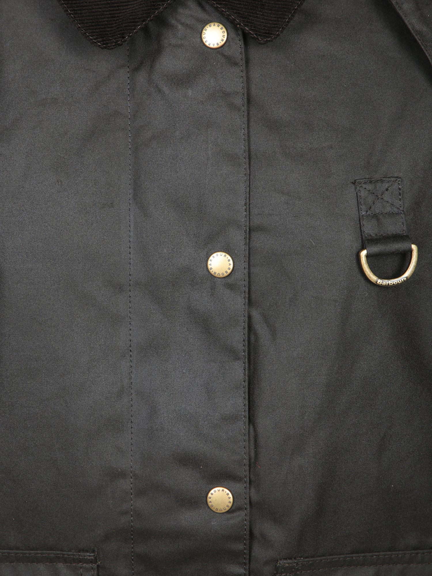 Waterproof waxed fabric. Snap button closure. Corduroy collar with leather detailing.