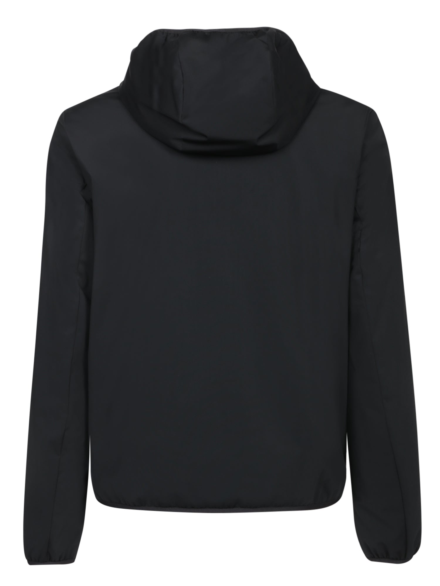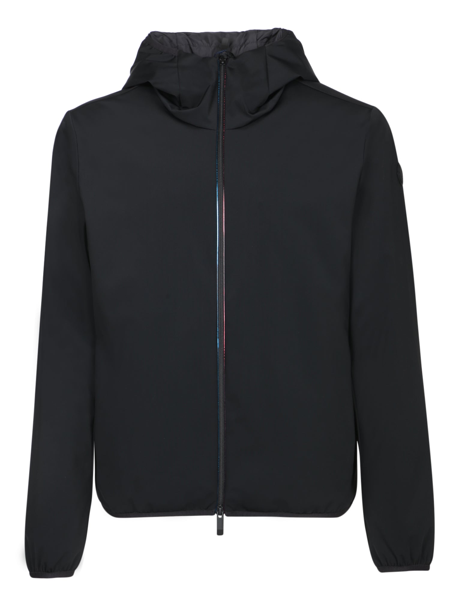 Shiny black technical fabric, adjustable hood, front zip closure, elasticated cuffs.