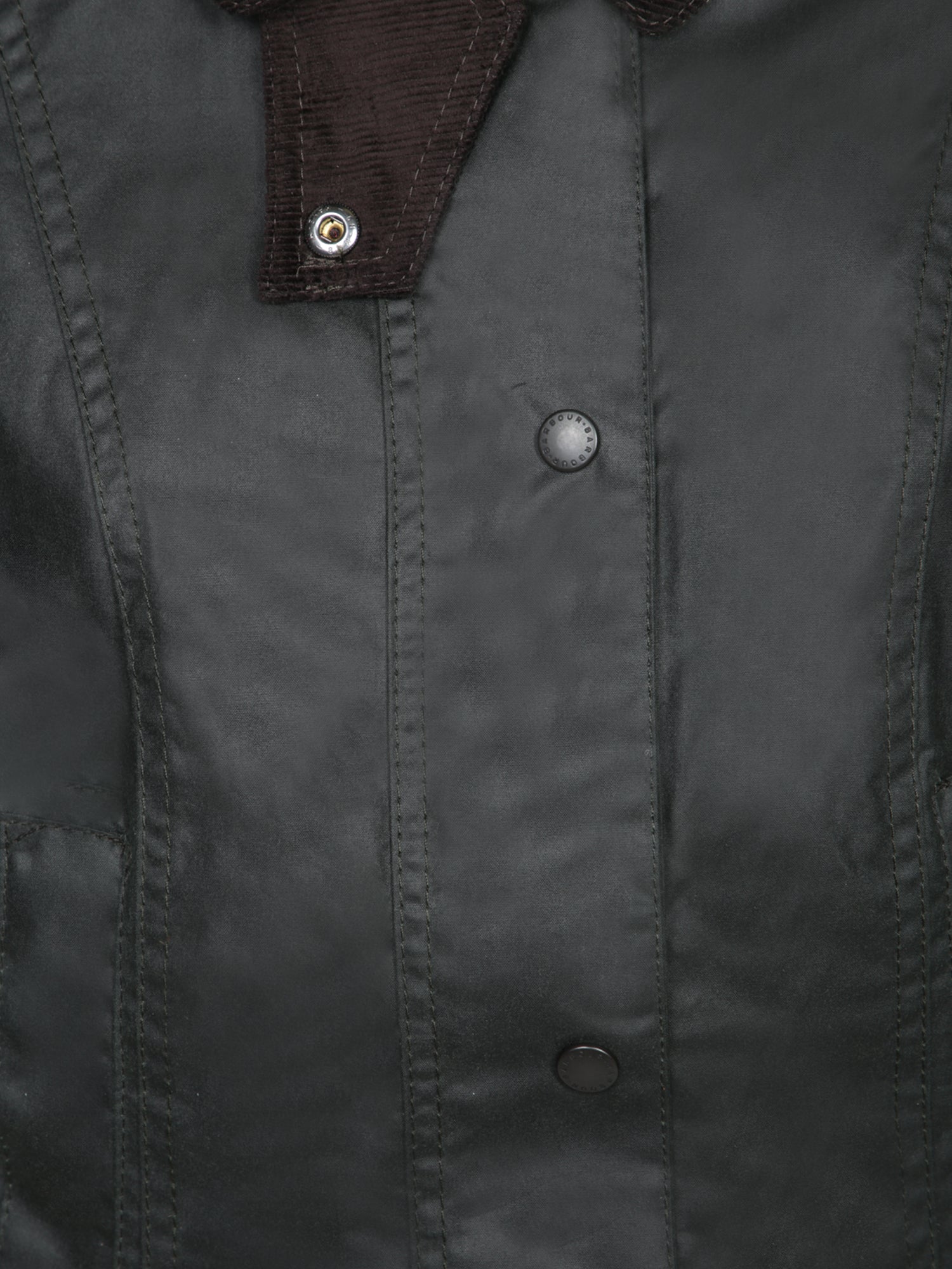 Waxed jacket with corduroy collar, button closure, patch pockets, and tartan lining.