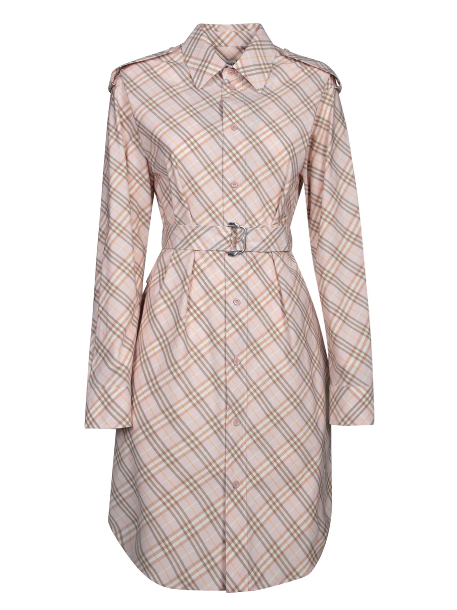 Elegant Burberry cotton poplin dress featuring the iconic check pattern. Features a classic collar, a button front closure, and a belt that accentuates the silhouette.