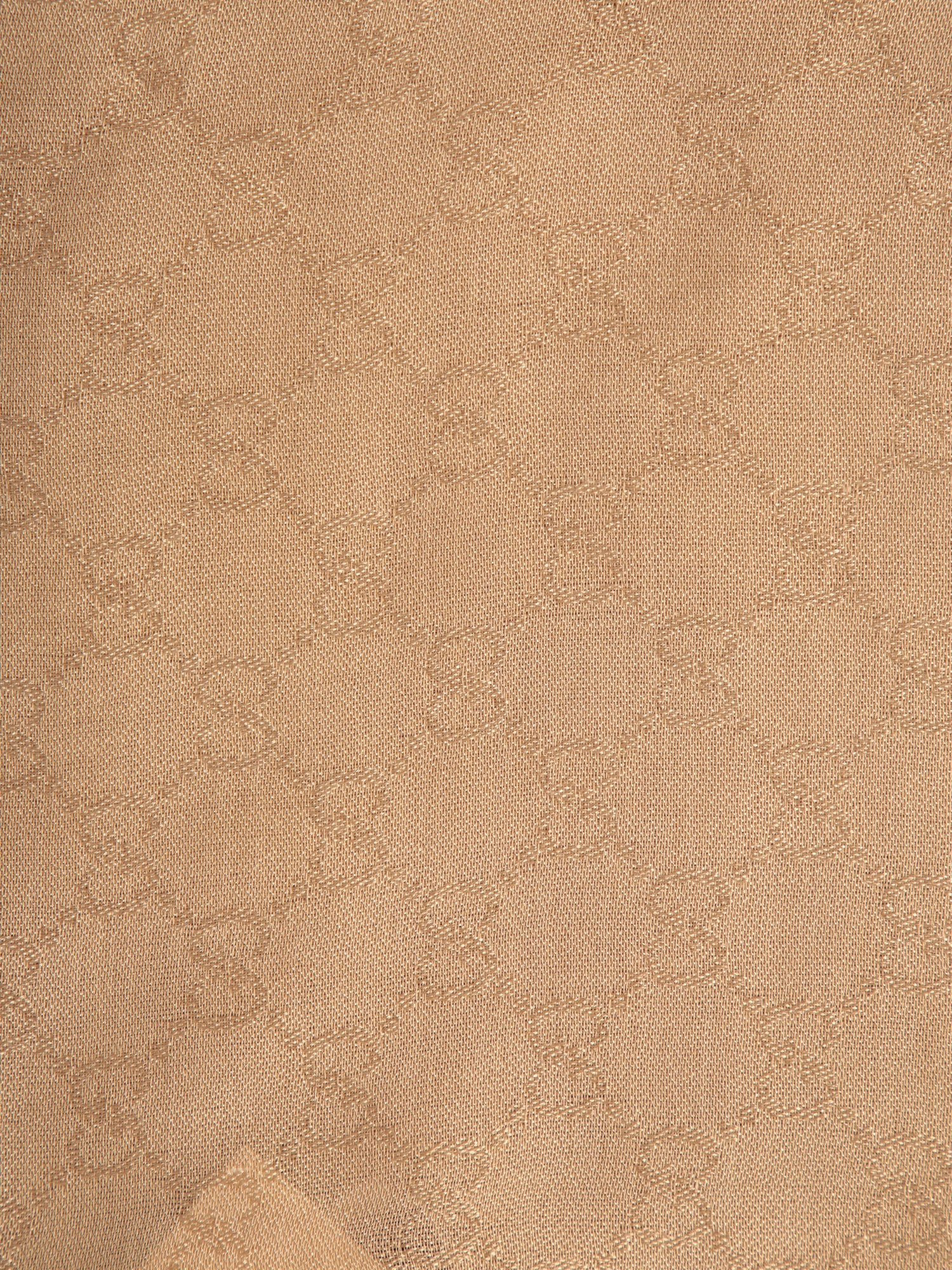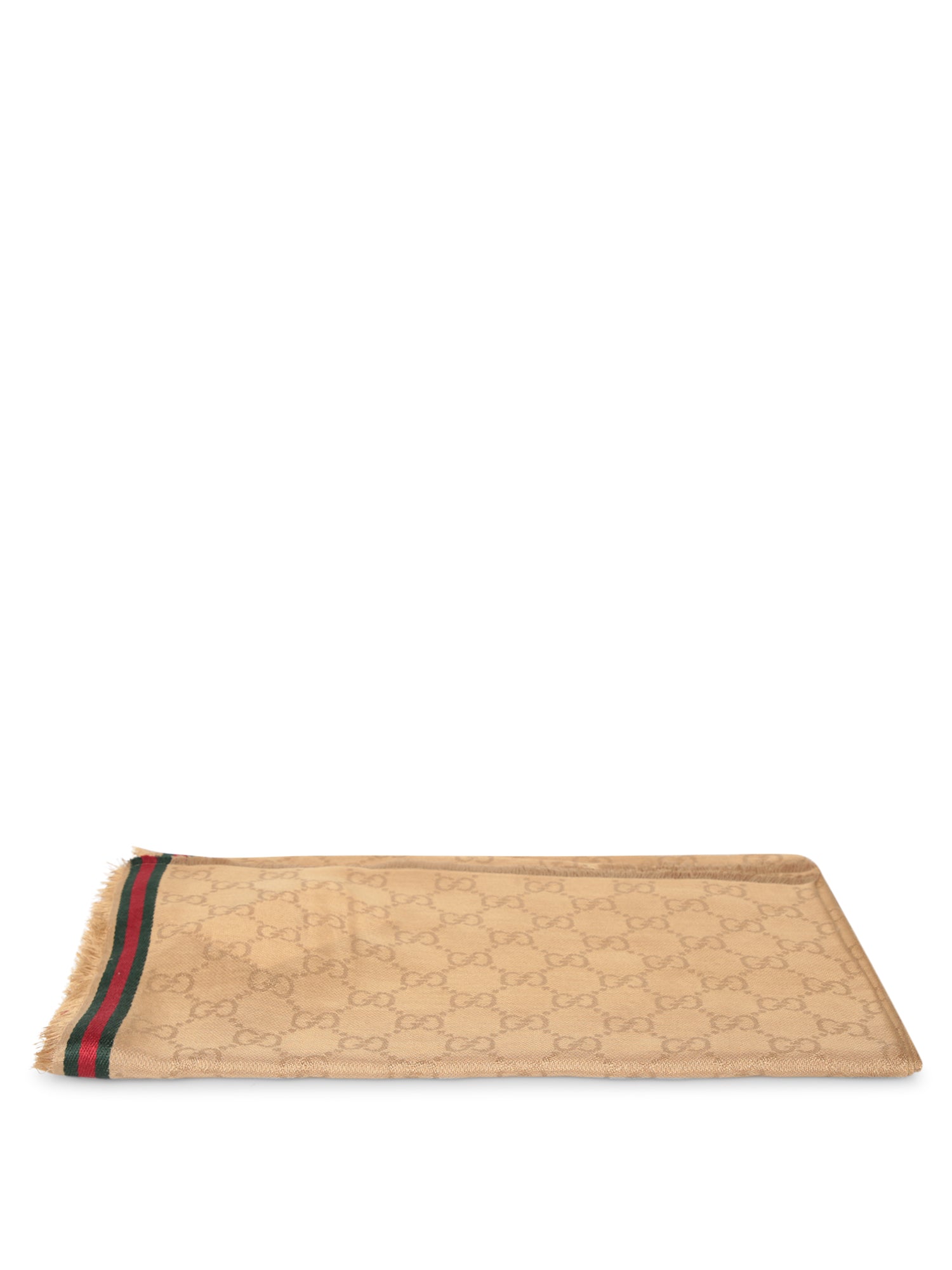 Beige scarf with all-over GG motif and green and red stripe on the sides. Fringed edges.