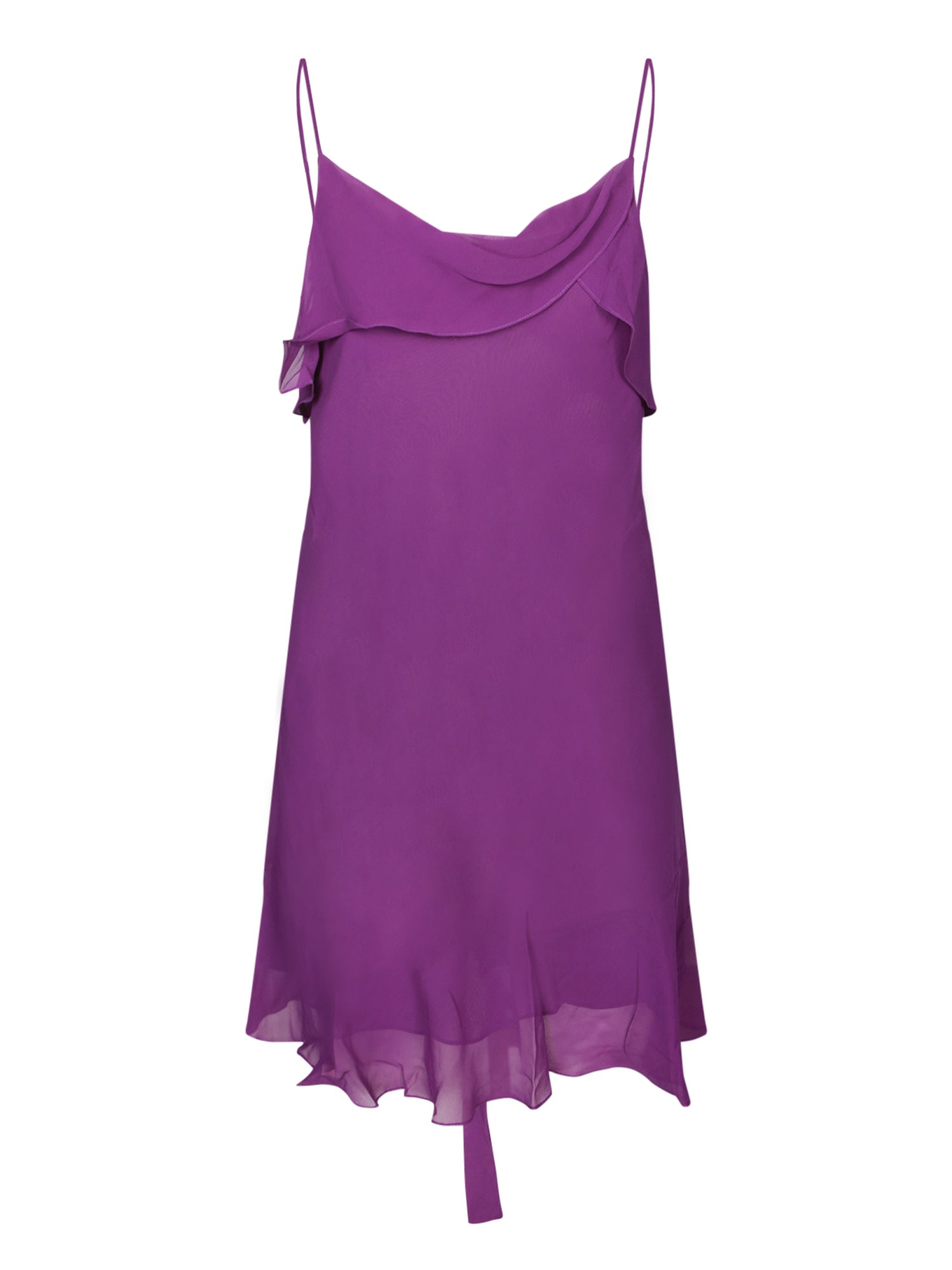 Sleeveless dress with adjustable thin straps. Features a draped neckline and a gathered asymmetrical hem.