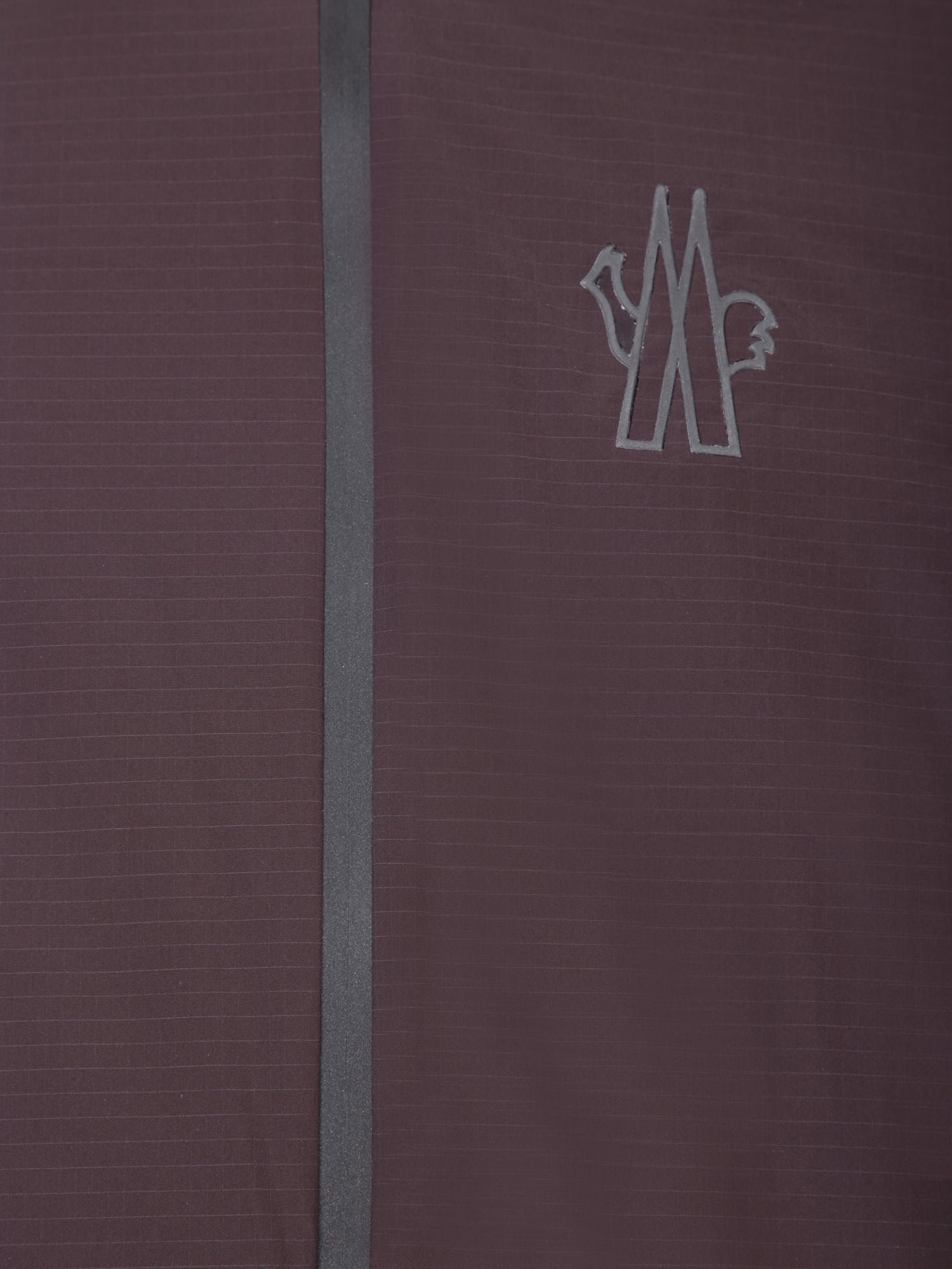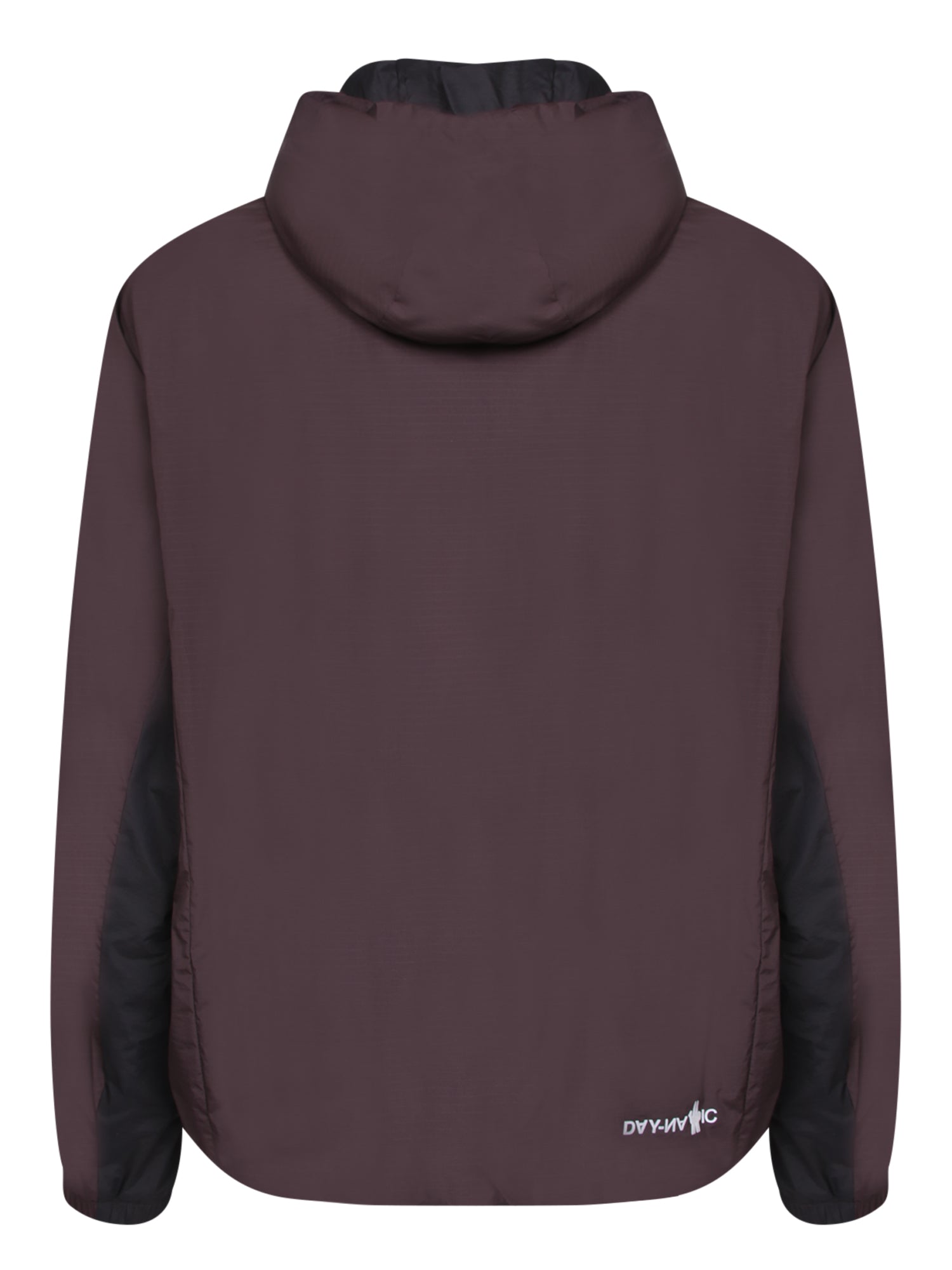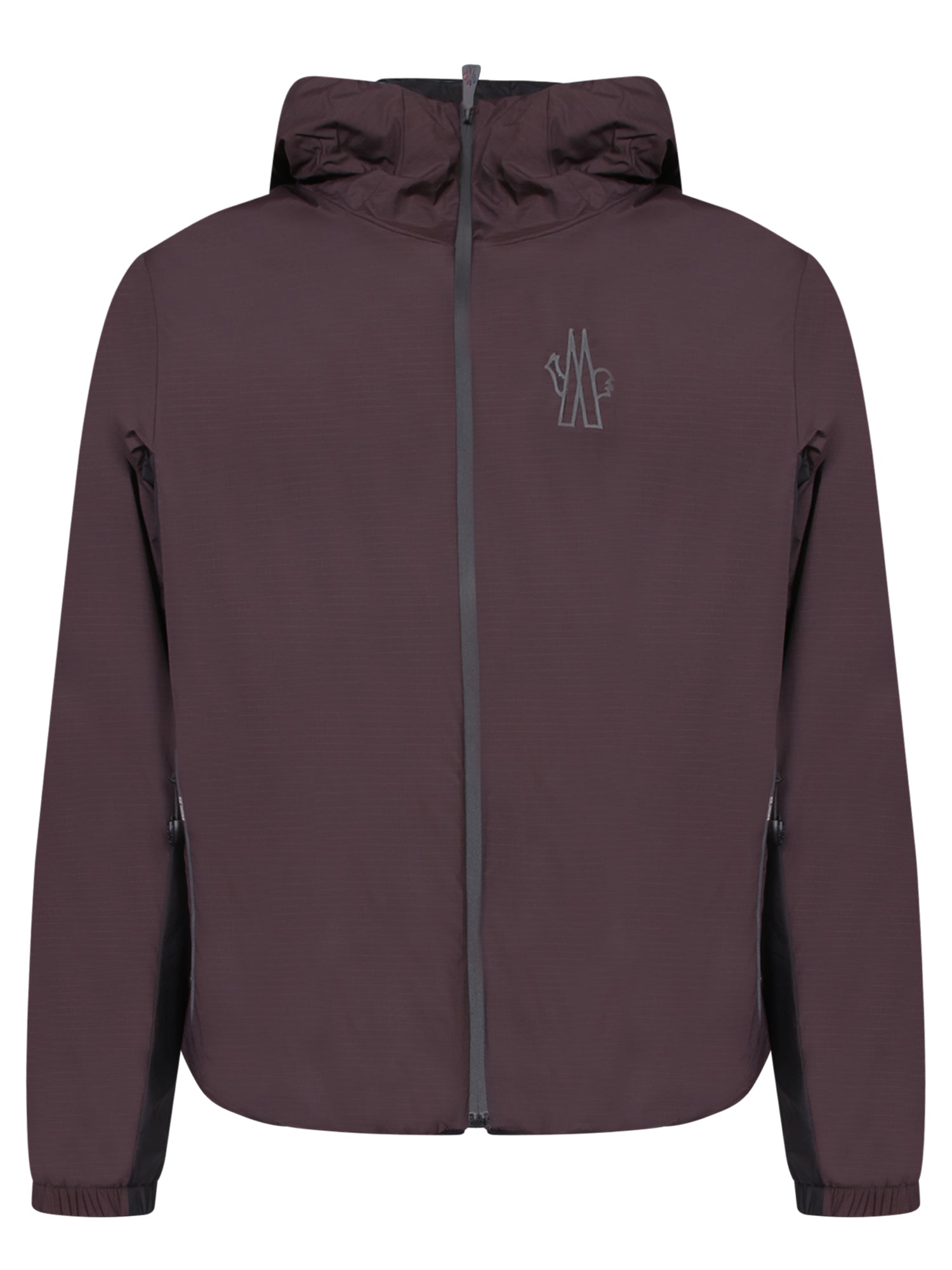 Technical jacket with integrated hood, central zip closure, side zip pockets.
