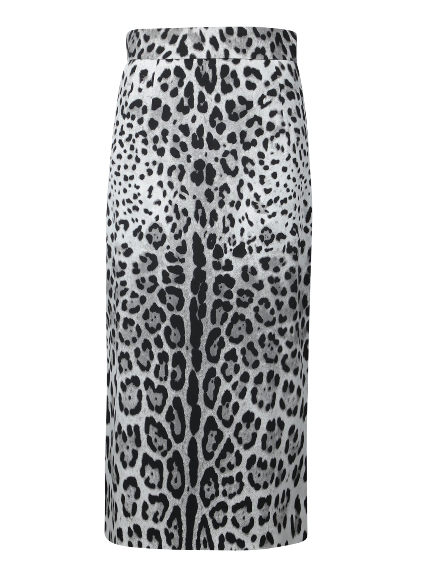 Mid-length skirt in jacquard fabric. Leopard motif in grey and black tones. Straight cut with hidden side closure.
