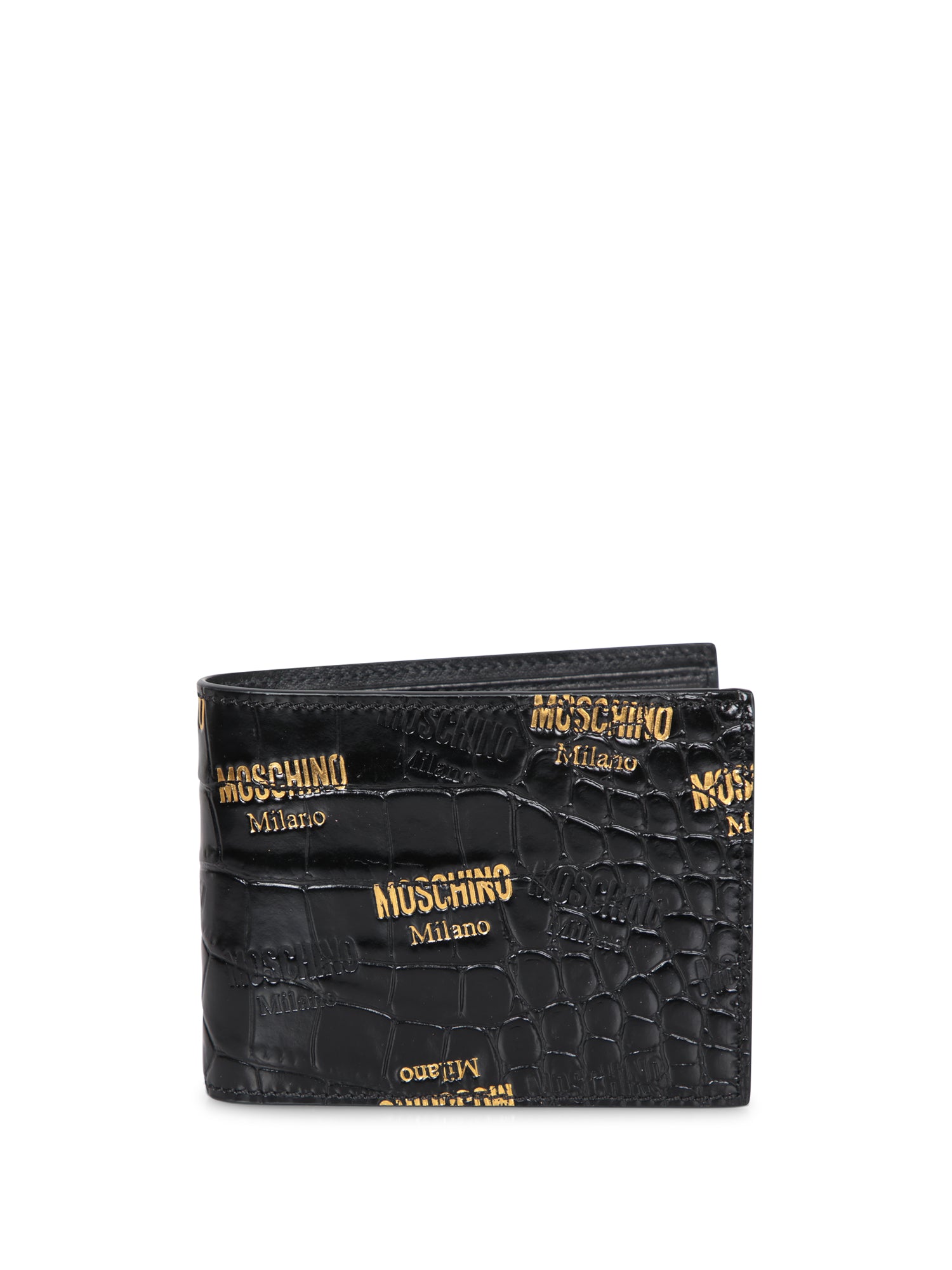 Exclusive Moschino black leather wallet featuring a crocodile effect, adorned with an embossed golden logo, offering an elegant and compact design suitable for every style.