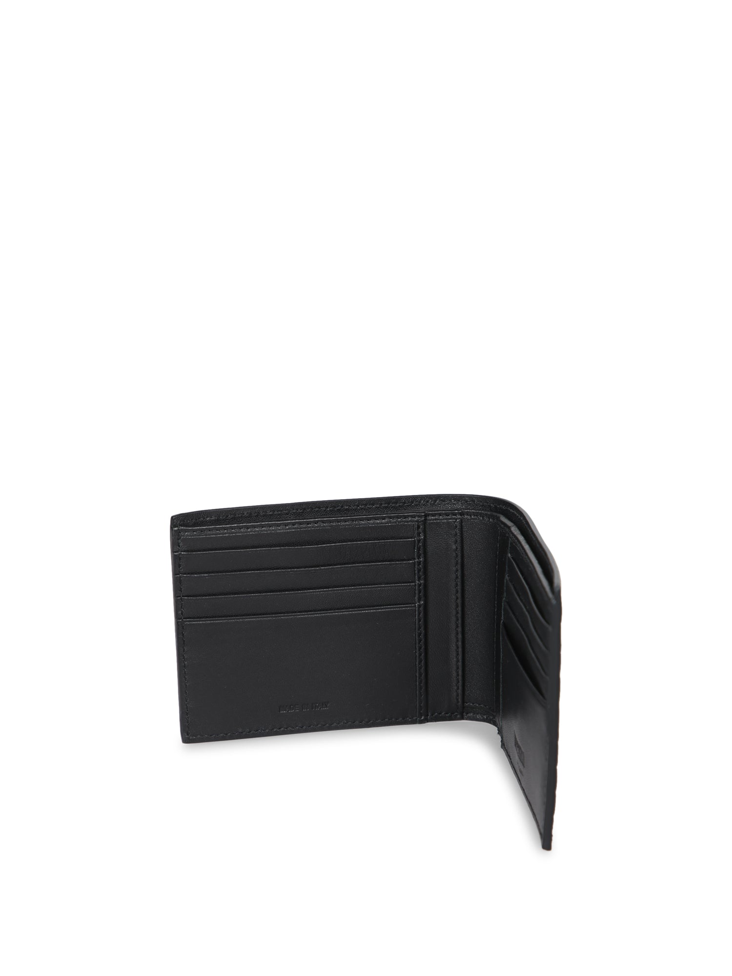 Leather wallet with crocodile effect. Embossed golden logo. Compact design.