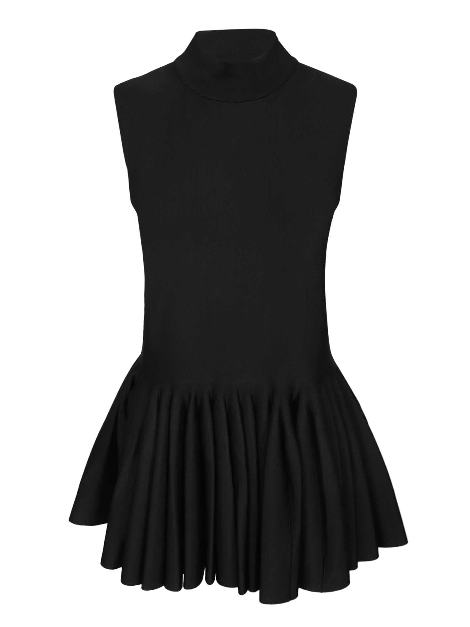 Elegant and sophisticated Alaïa top featuring a sleeveless design with a high collar, perfect for a slender silhouette. The flared hem adds a touch of femininity and movement.