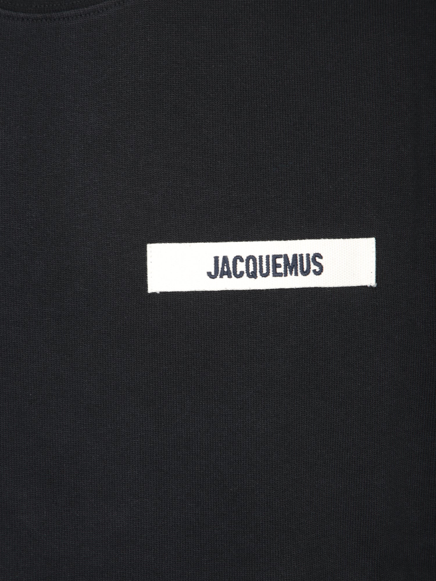 Black cotton t-shirt. Short sleeves. 'JACQUEMUS' logo on a white label applied on the front.