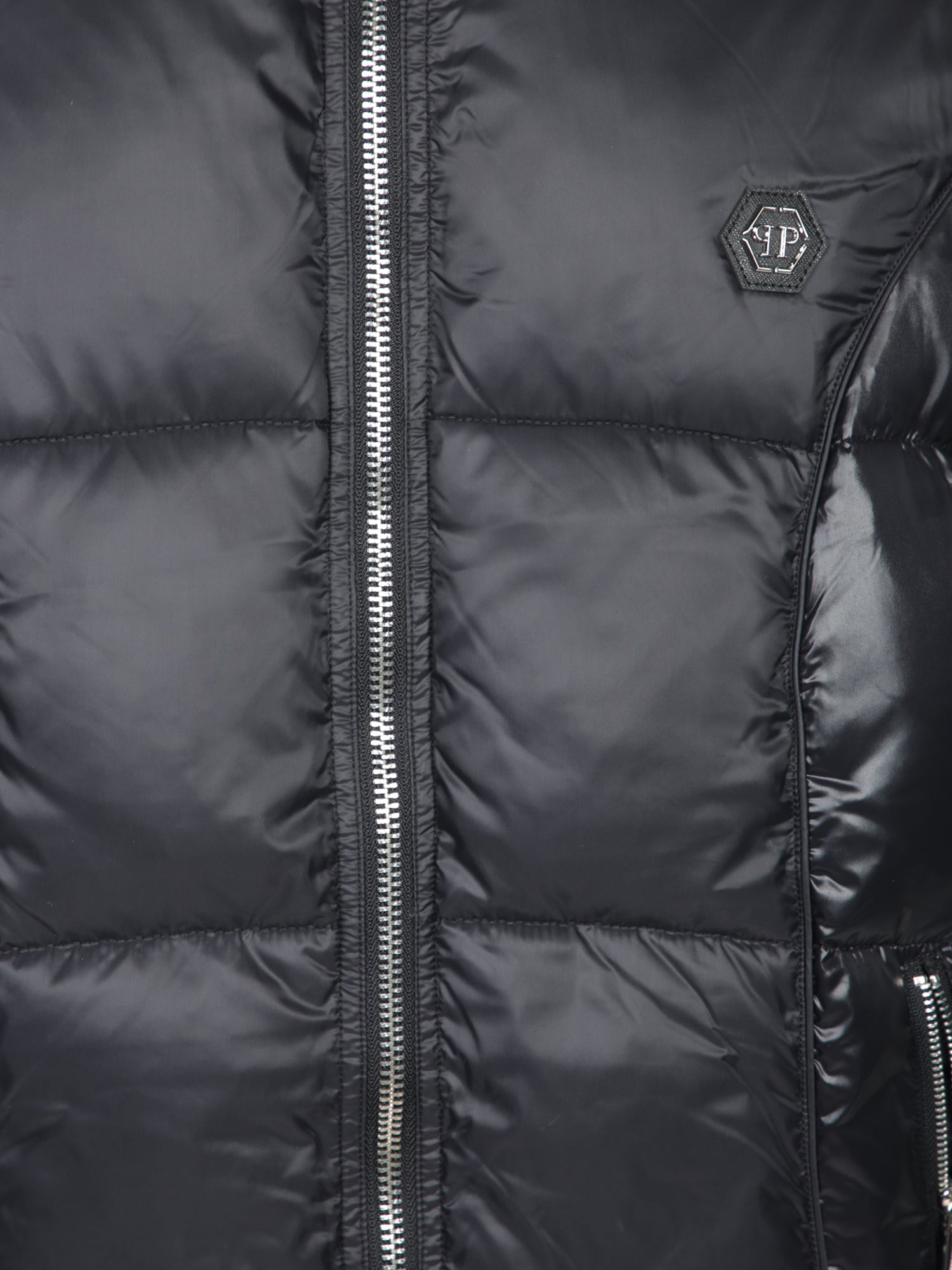 Padded jacket with adjustable hood. Features a front zip closure, side zip pockets, and ribbed knit cuffs.