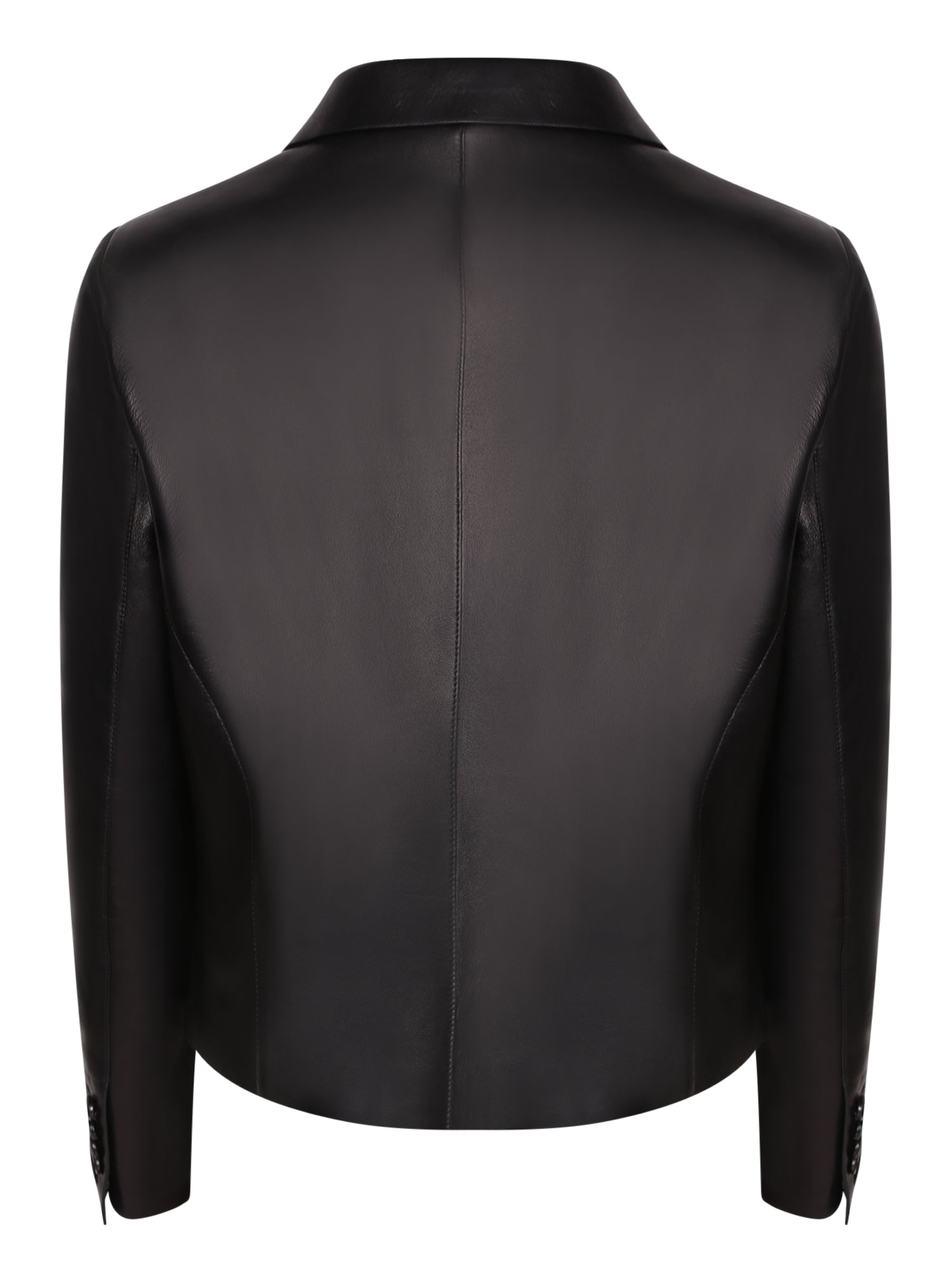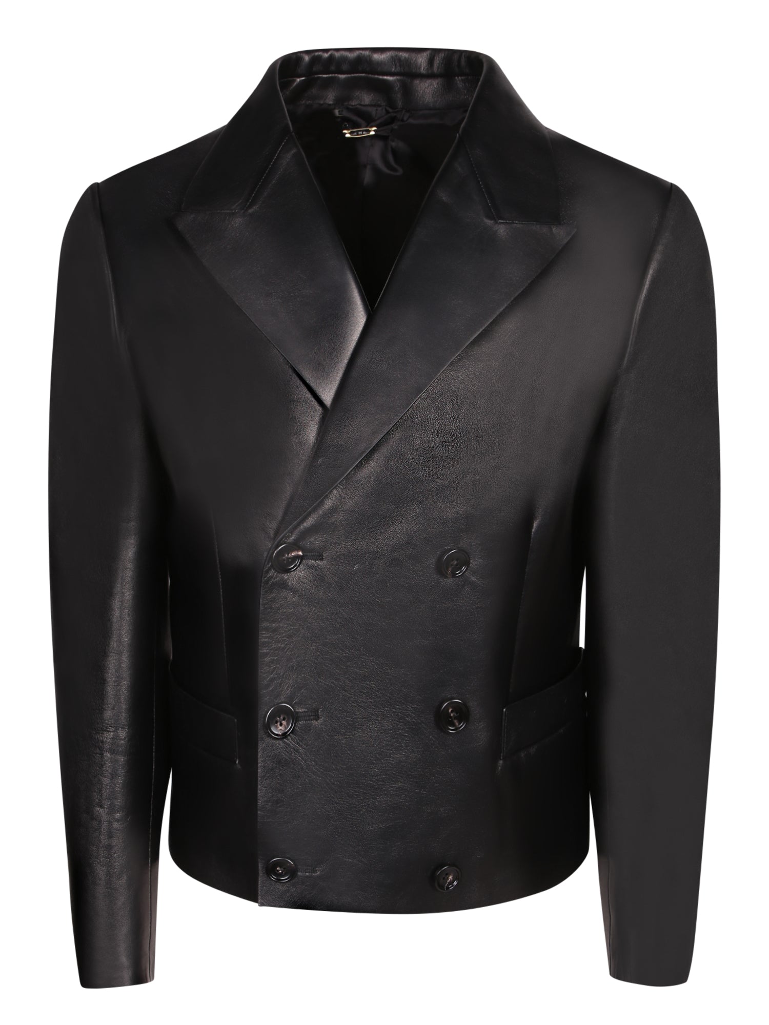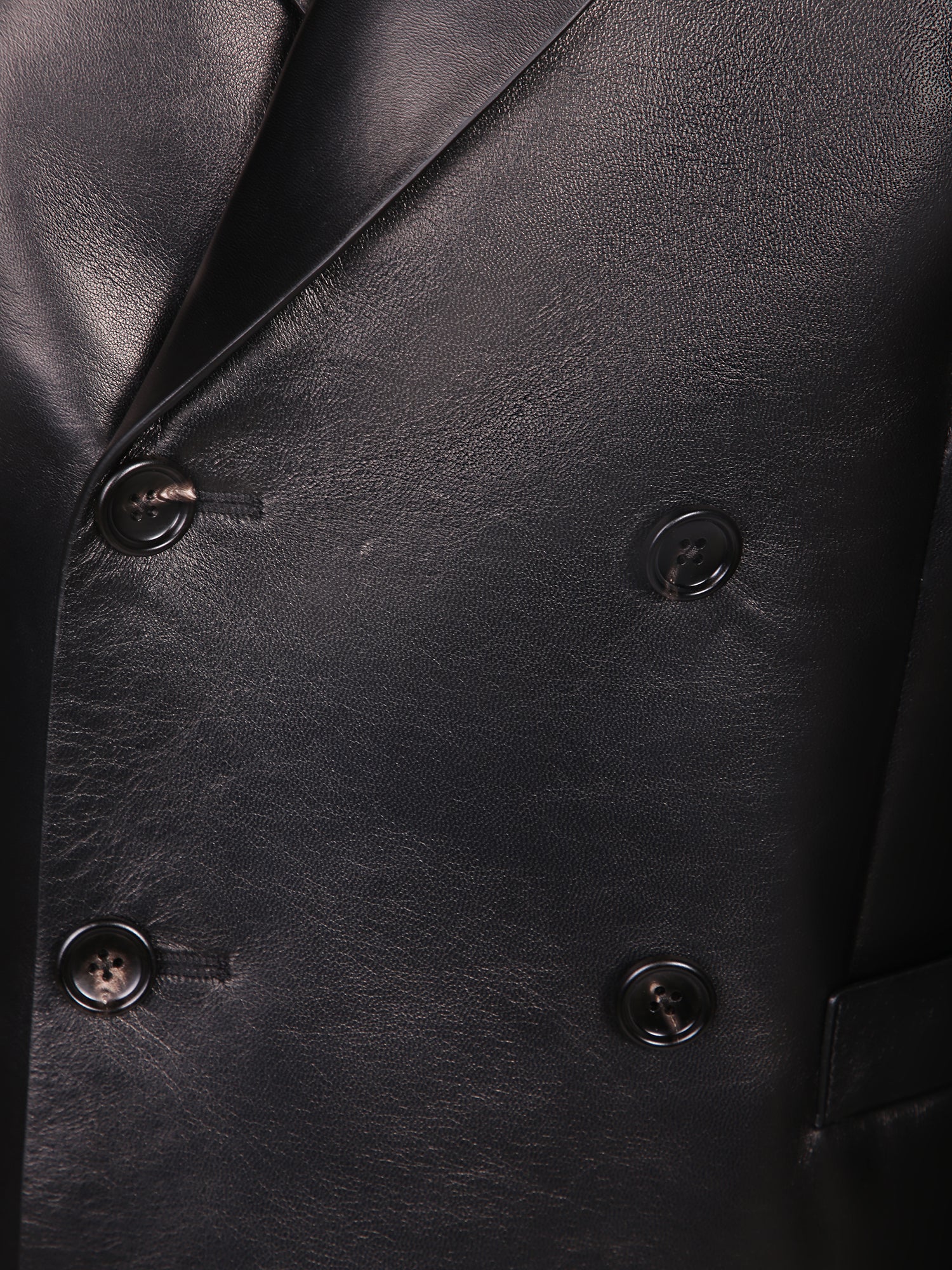 Double-breasted leather jacket. Lapel collar. Button closure.