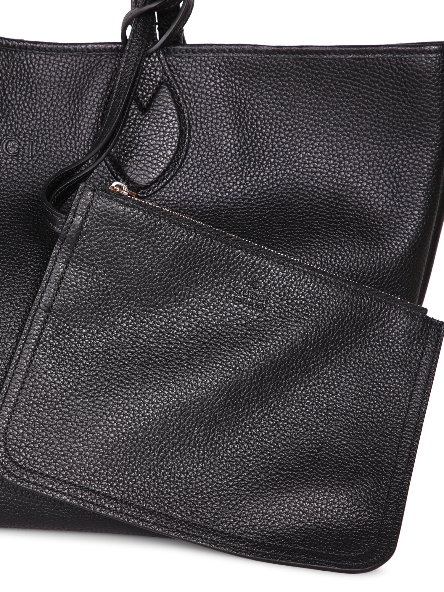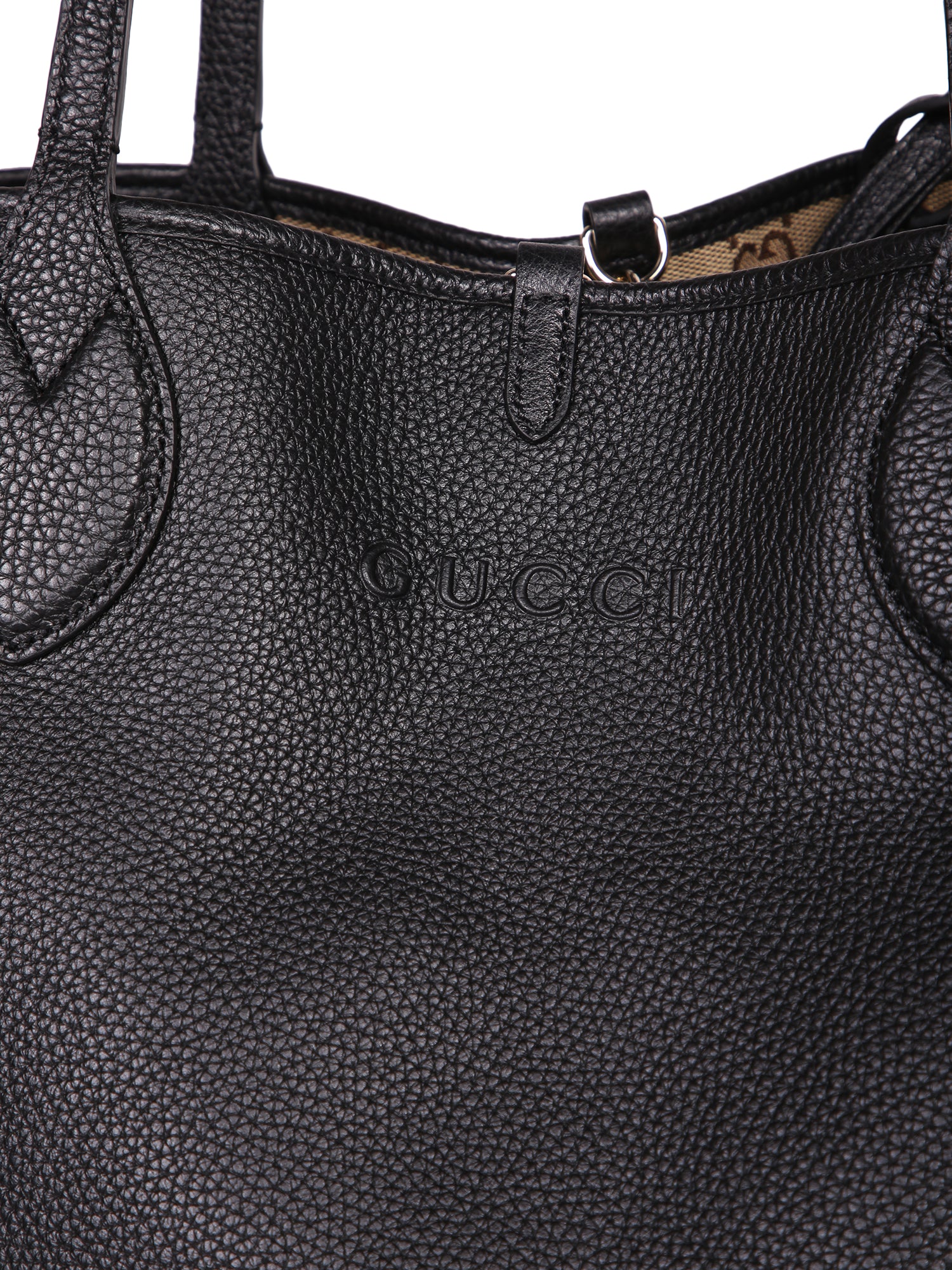 Black leather bag with a matte finish. Features rounded top handles and embossed Gucci logo.