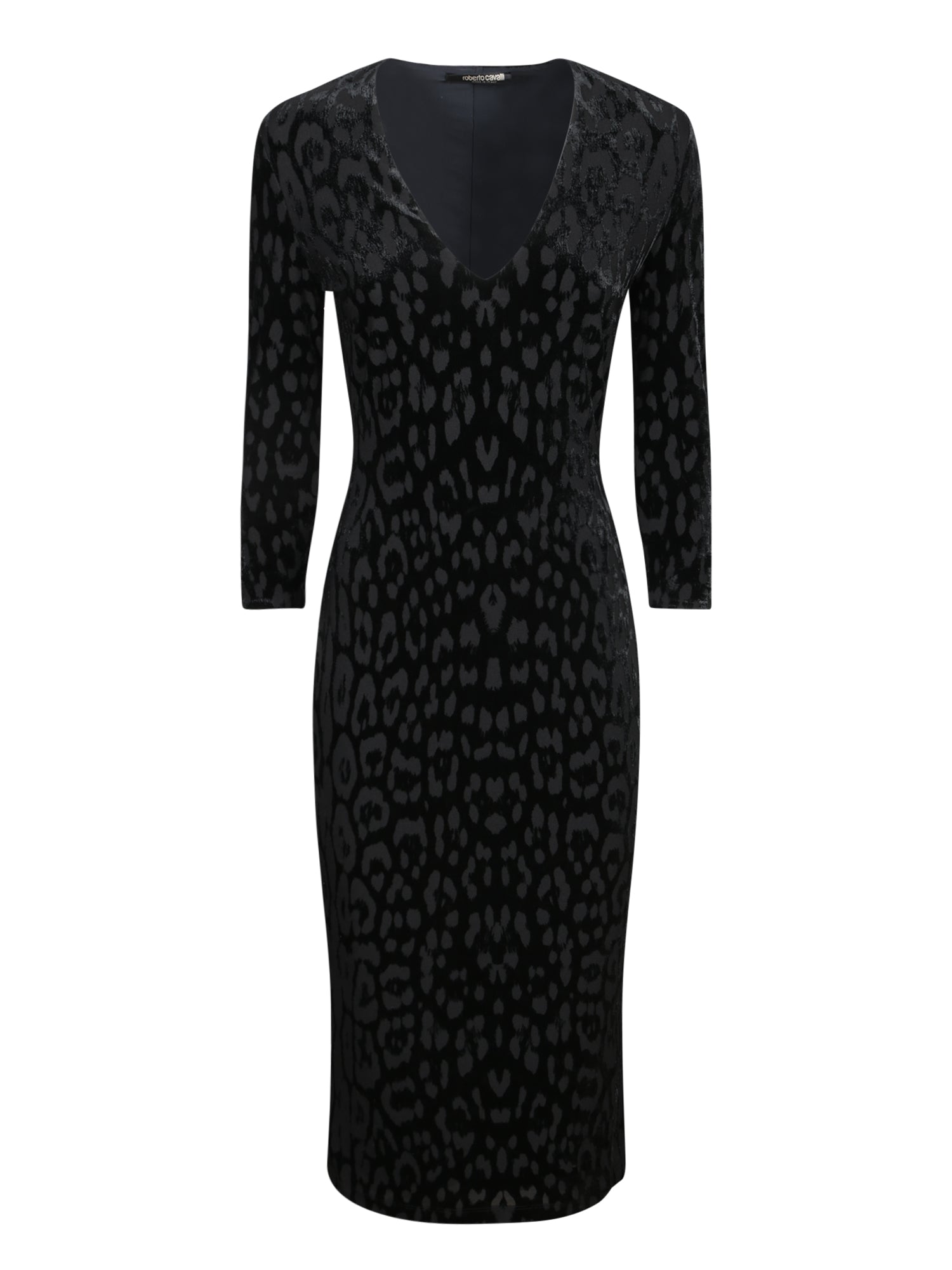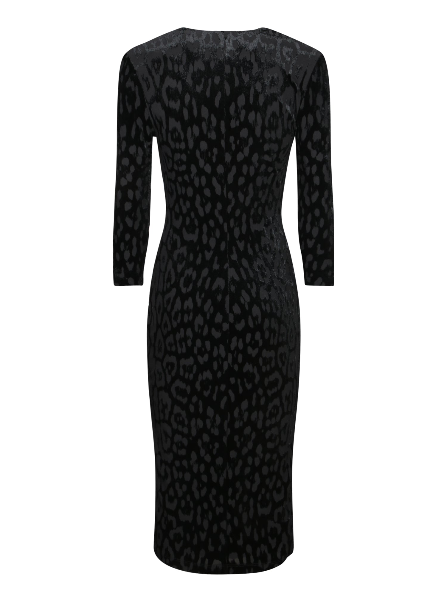 Long sleeve midi dress in velvet with leopard print. Deep V-neckline, snug fit.