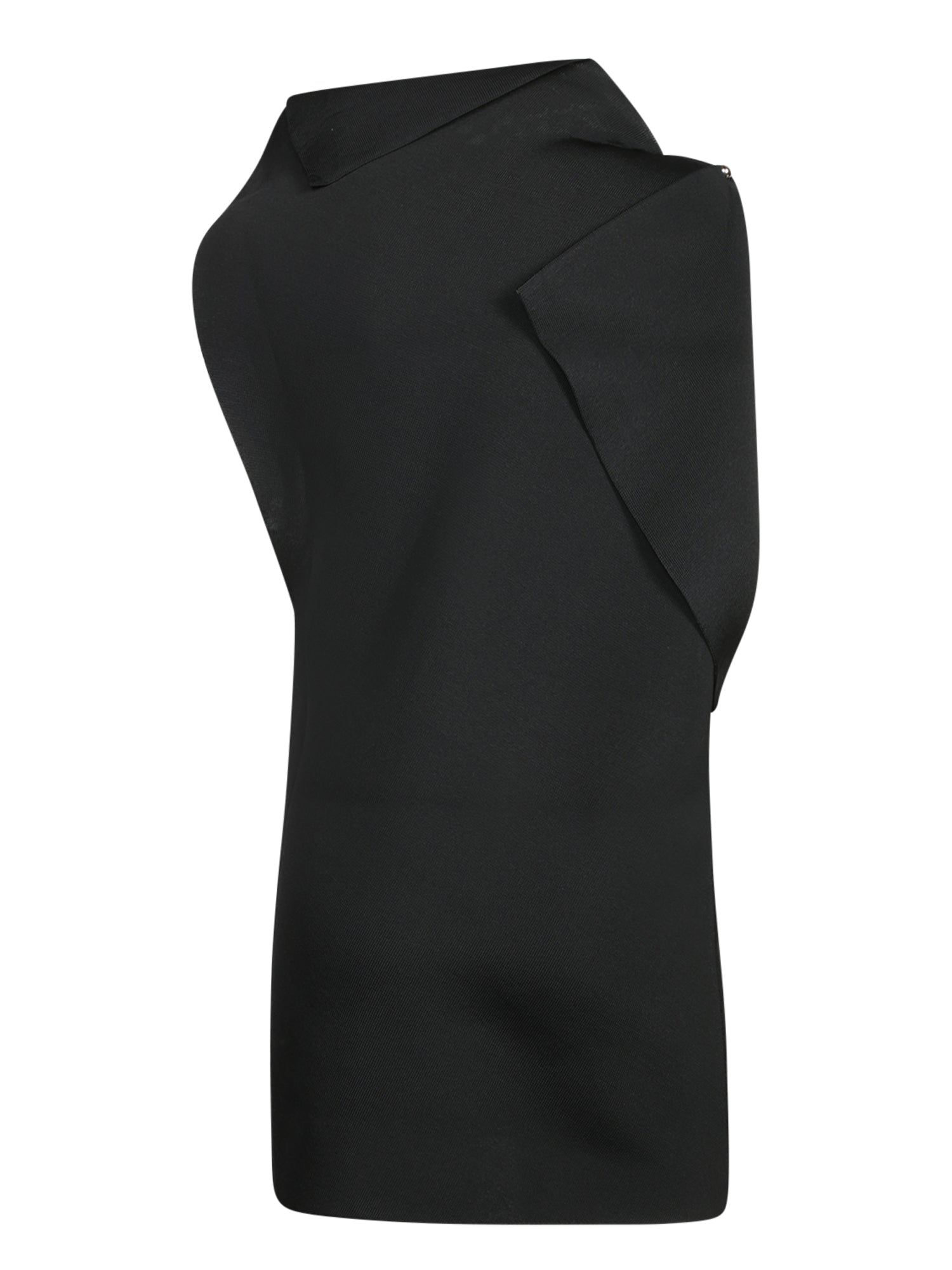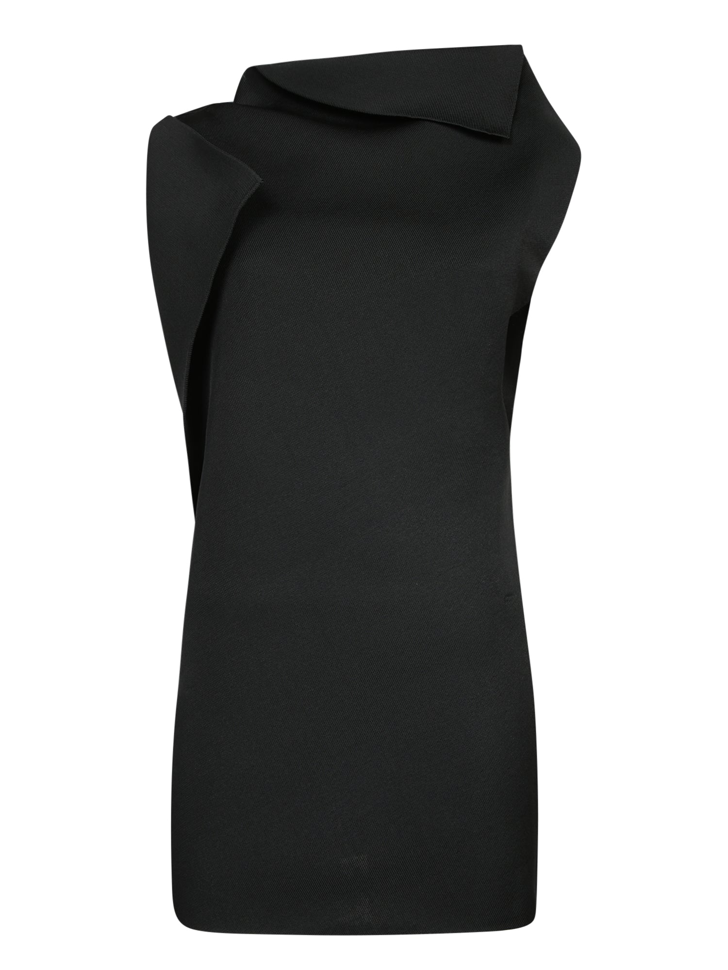 Sleeveless dress. Draped shawl collar. Trapeze cut.