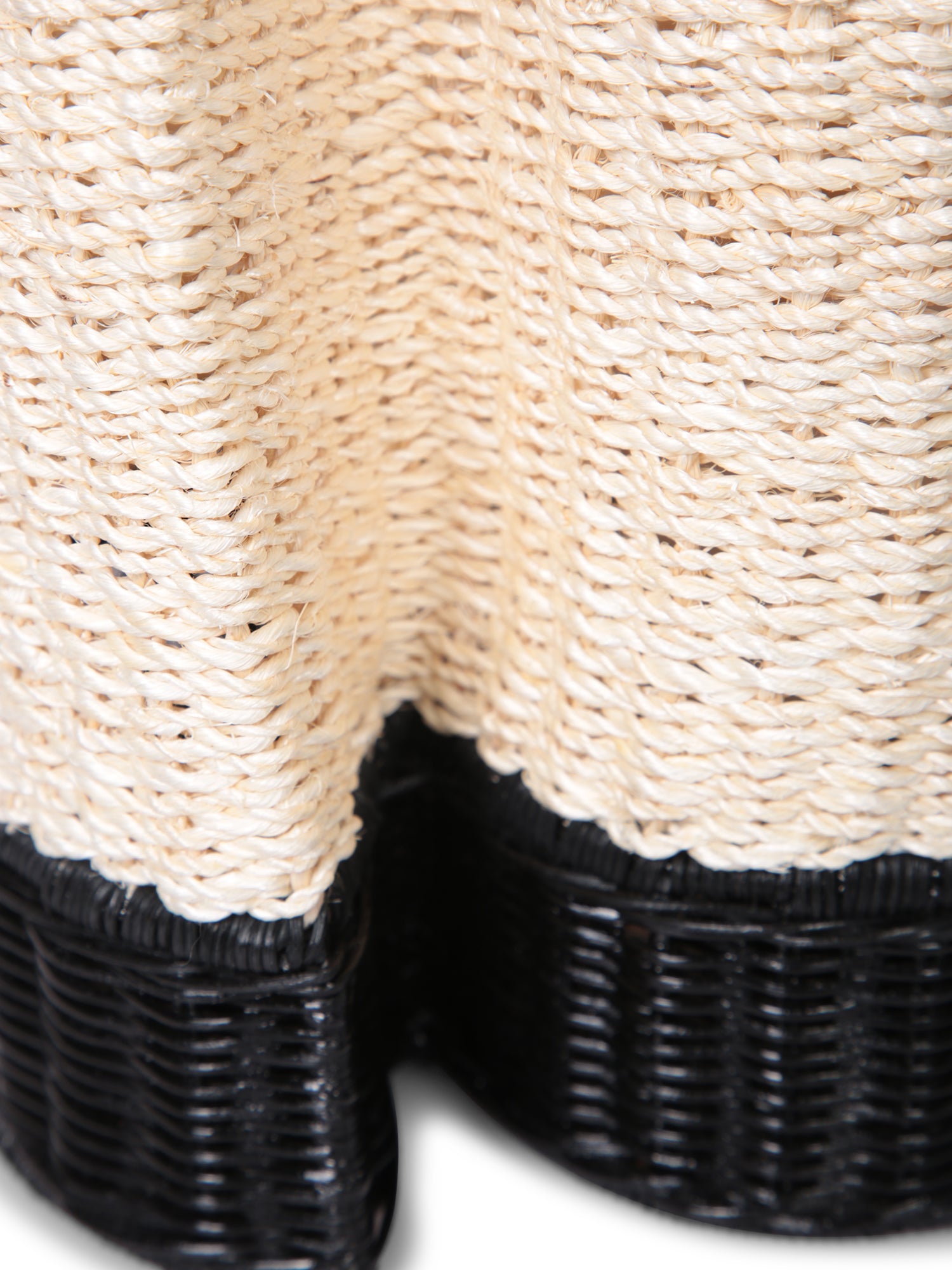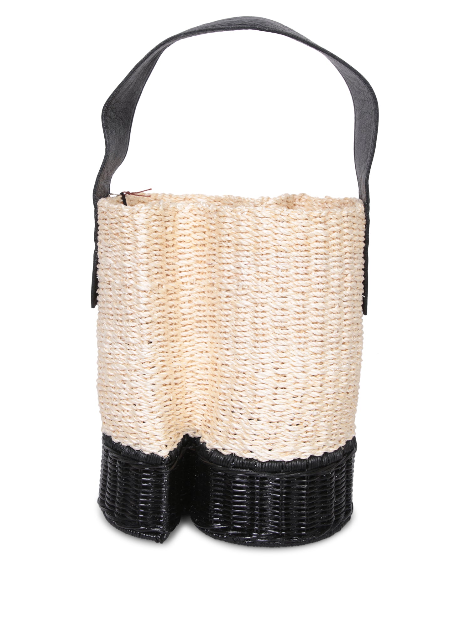 Woven raffia bucket bag. Black leather trims. Single top handle.