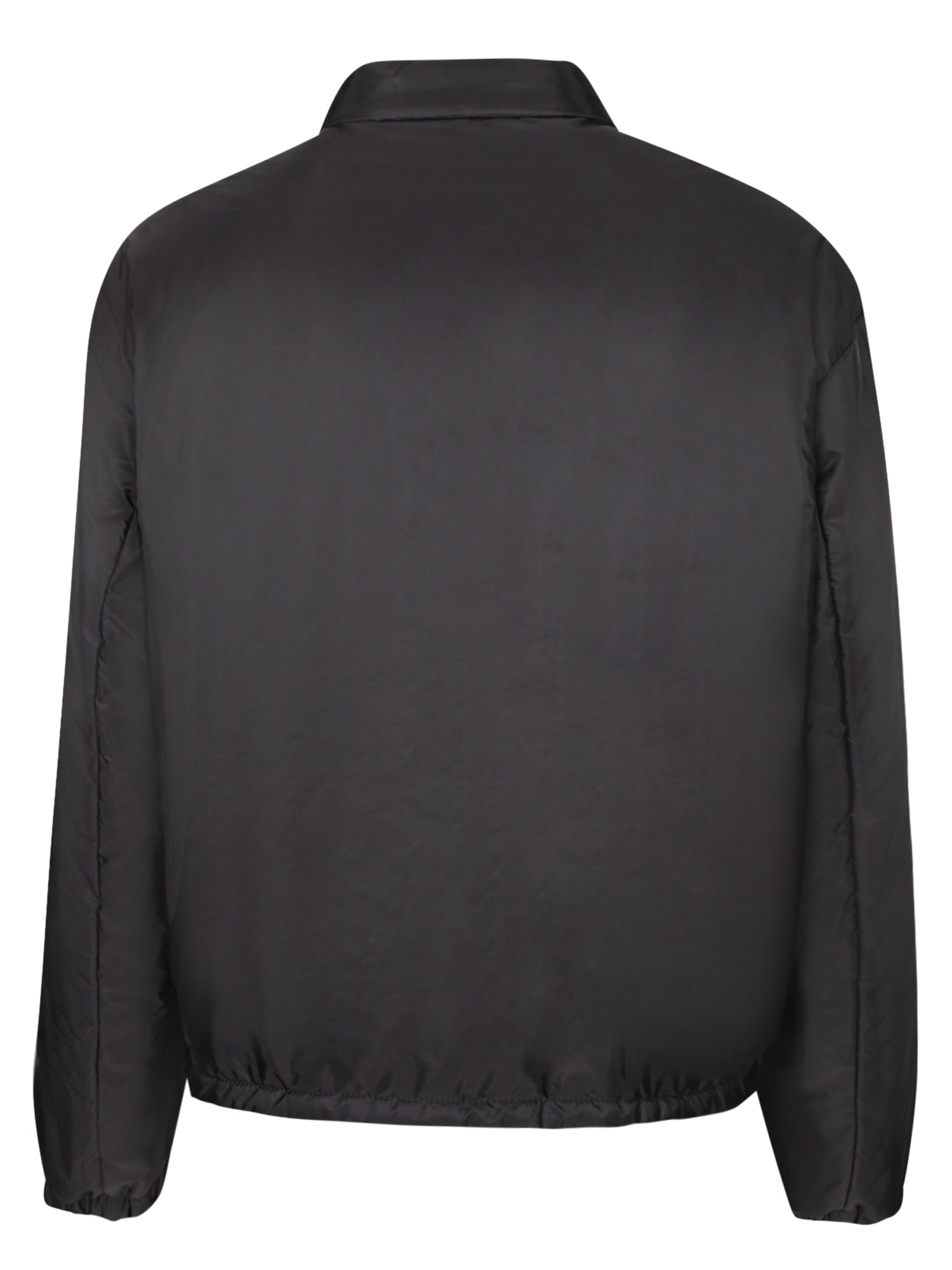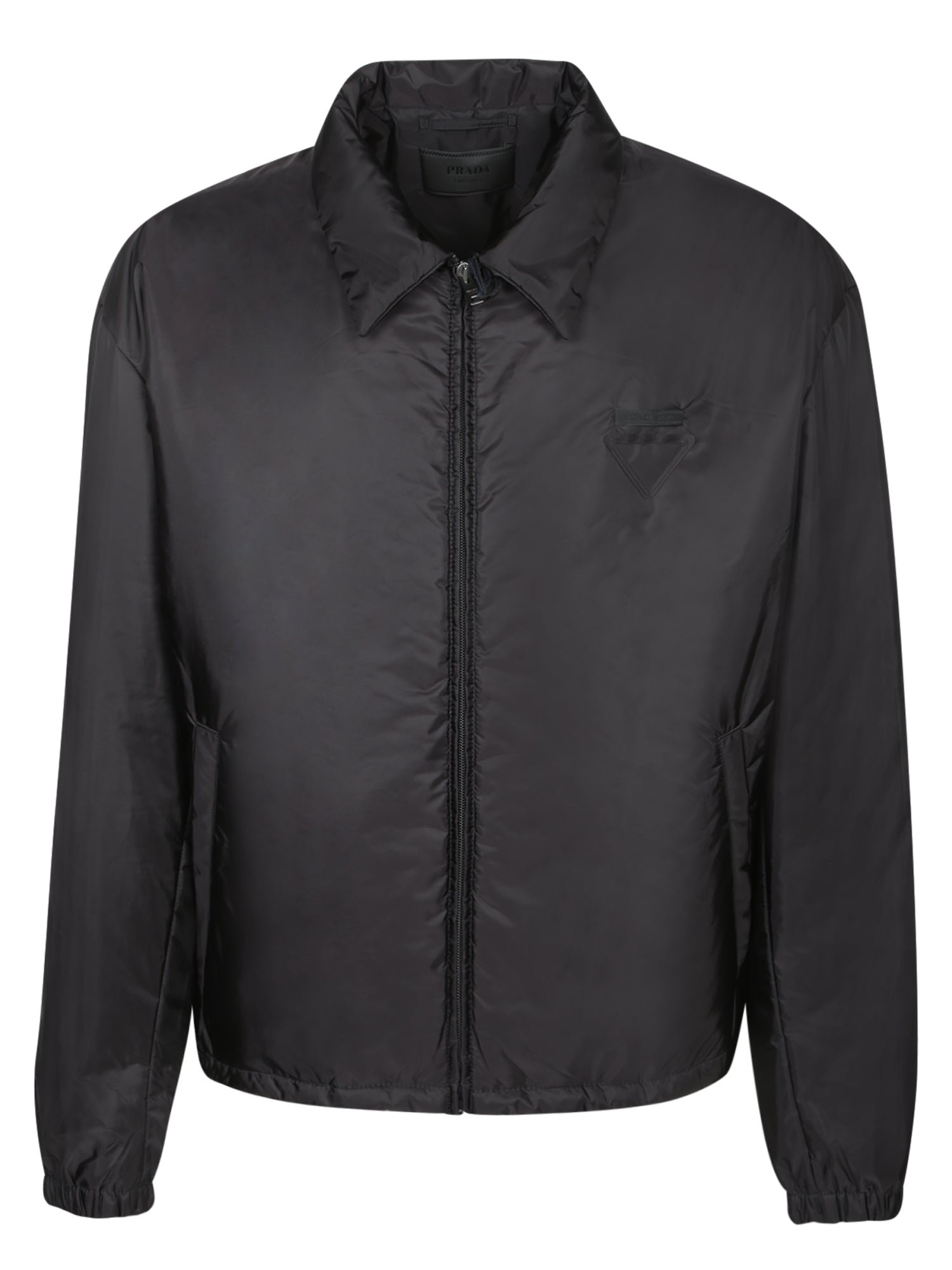 Black nylon jacket with front zip. High collar and Prada triangle logo on the chest.