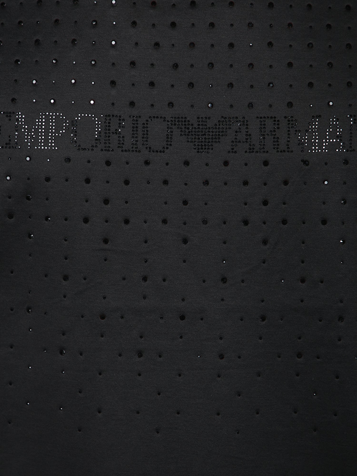 Black short-sleeved t-shirt. Emporio Armani rhinestone logo. Perforated fabric.