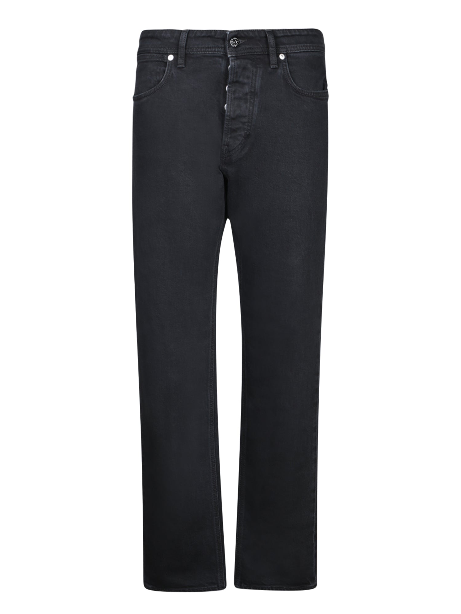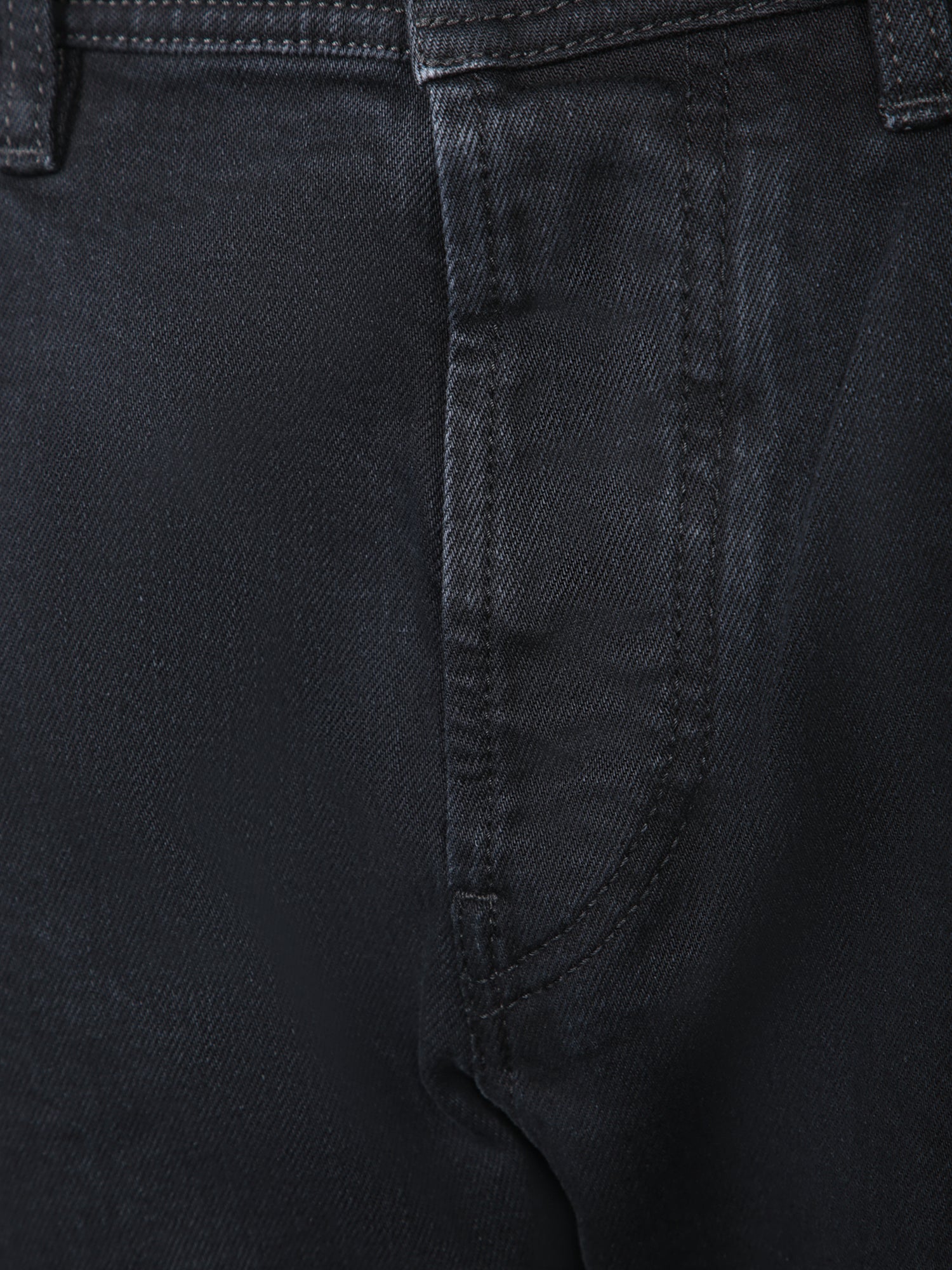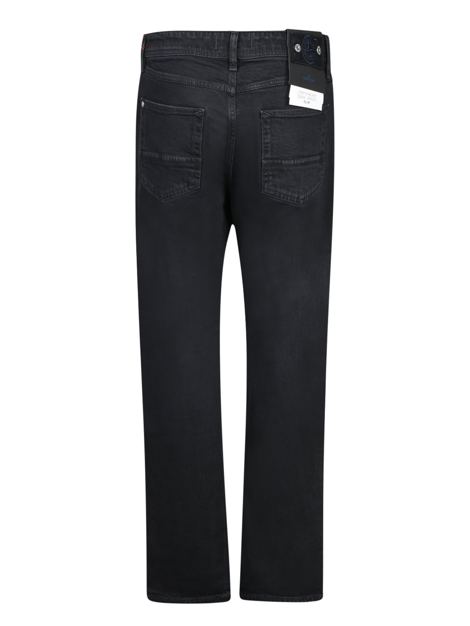 Slim fit jeans. Stretch denim fabric. Five-pocket styling. Zip and button closure.