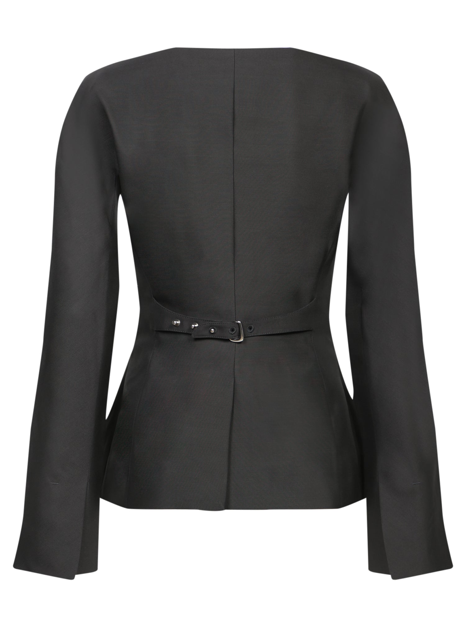 Structured black jacket with accentuated shoulders. Welt pockets at the front. Smooth and sophisticated fabric.