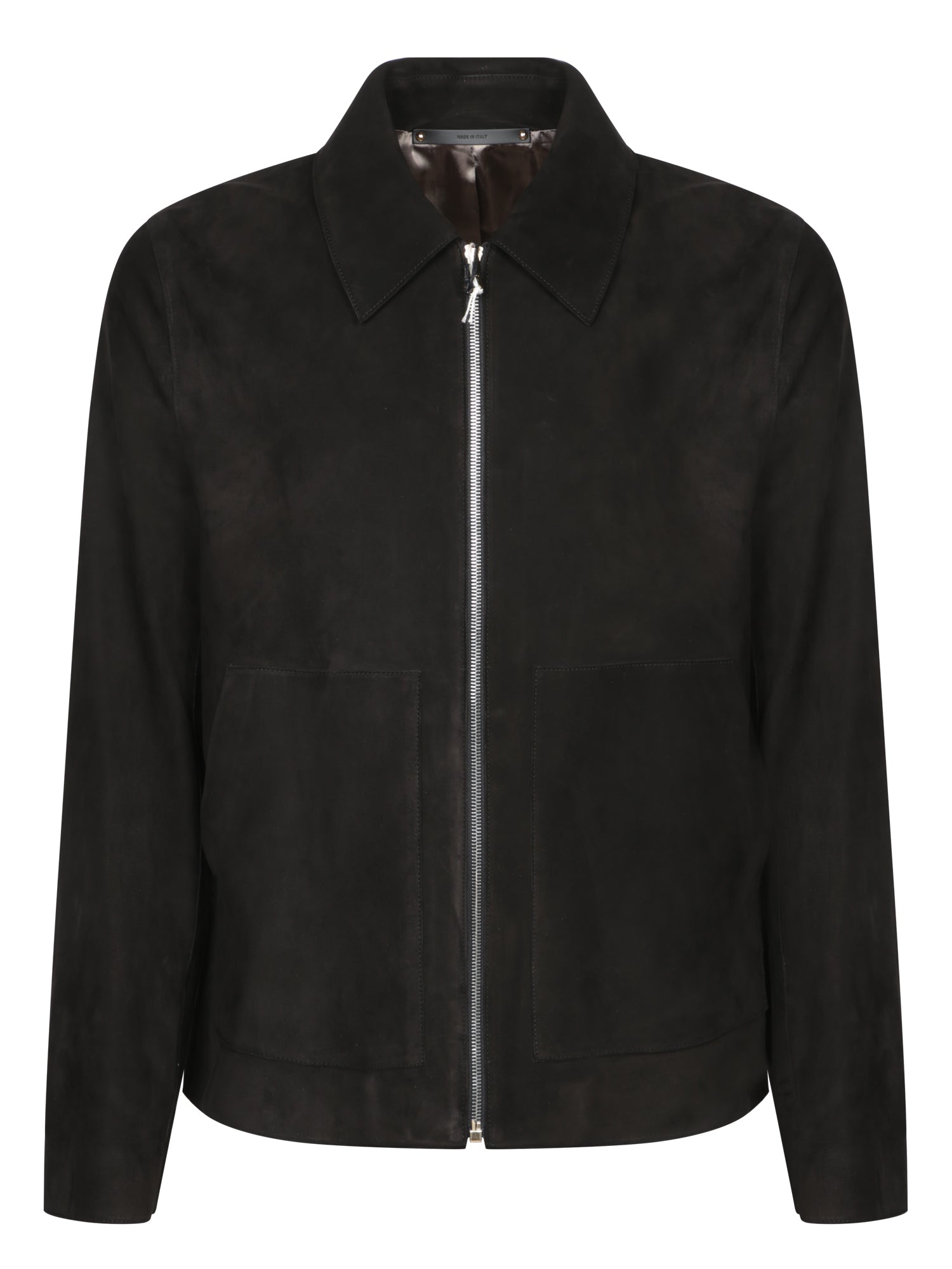 Suede jacket with front zip closure. Classic collar and welt pockets.