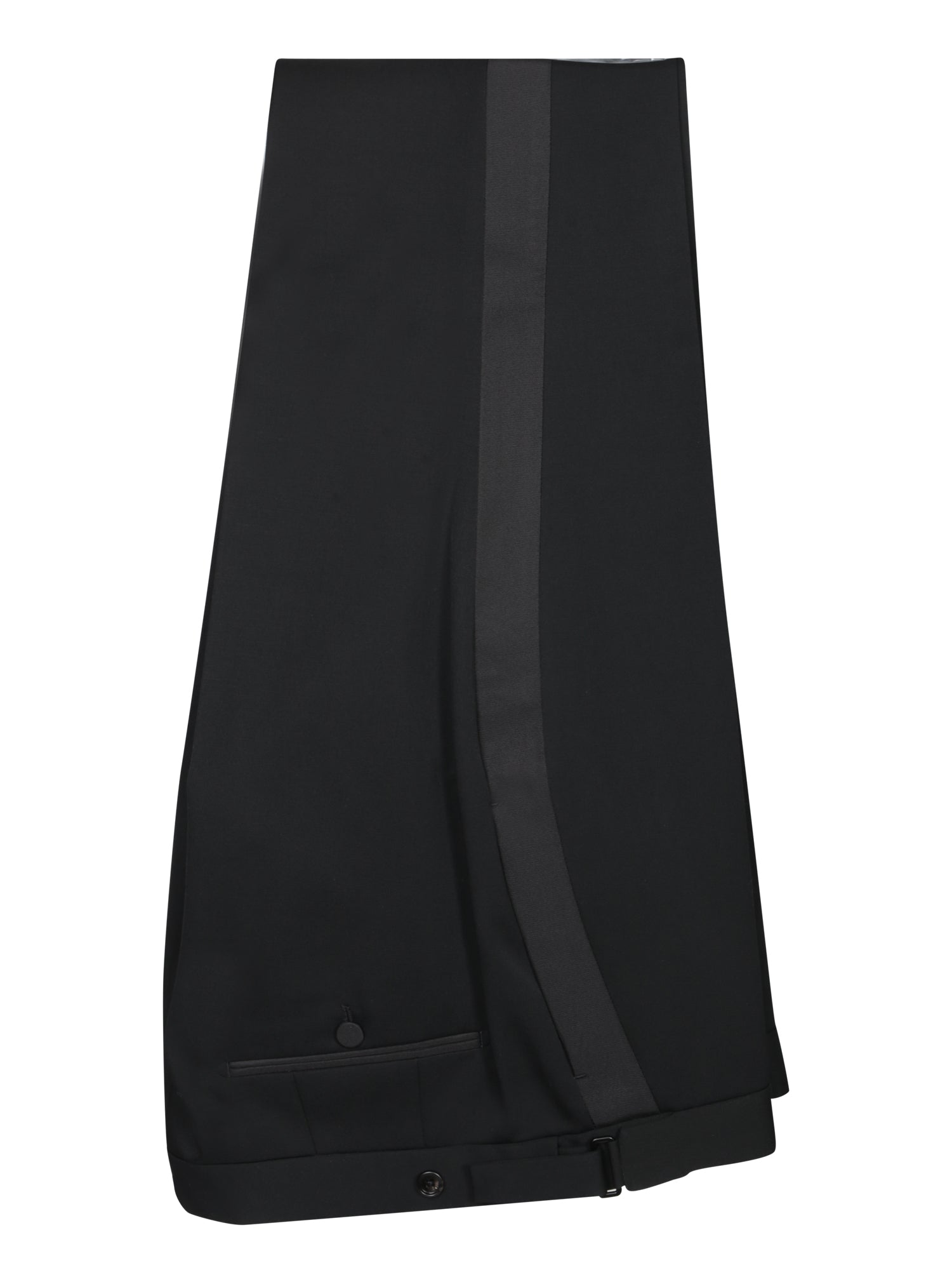 Single-breasted tuxedo with peak lapels. Silk lining, single front button, flap pockets.