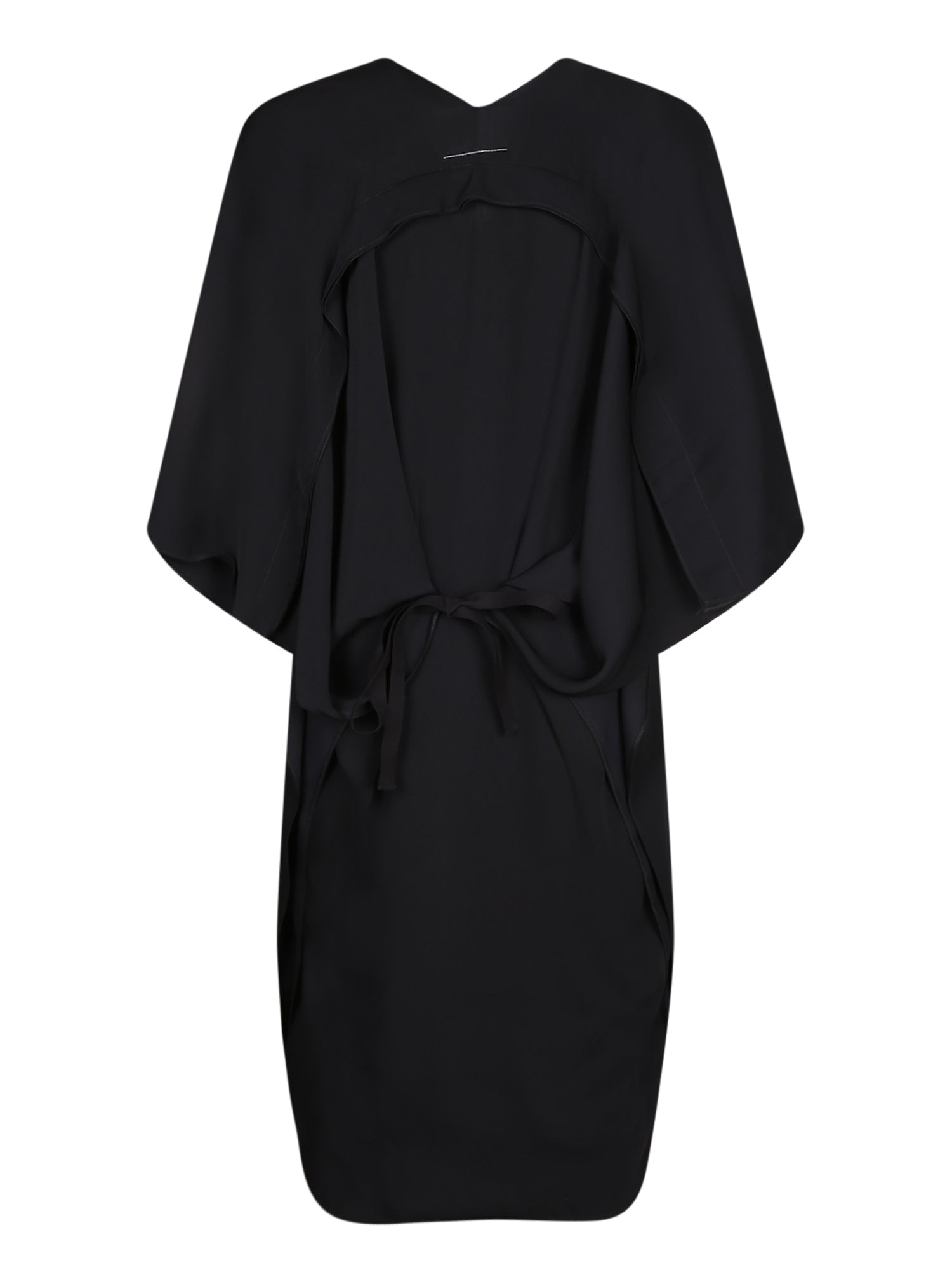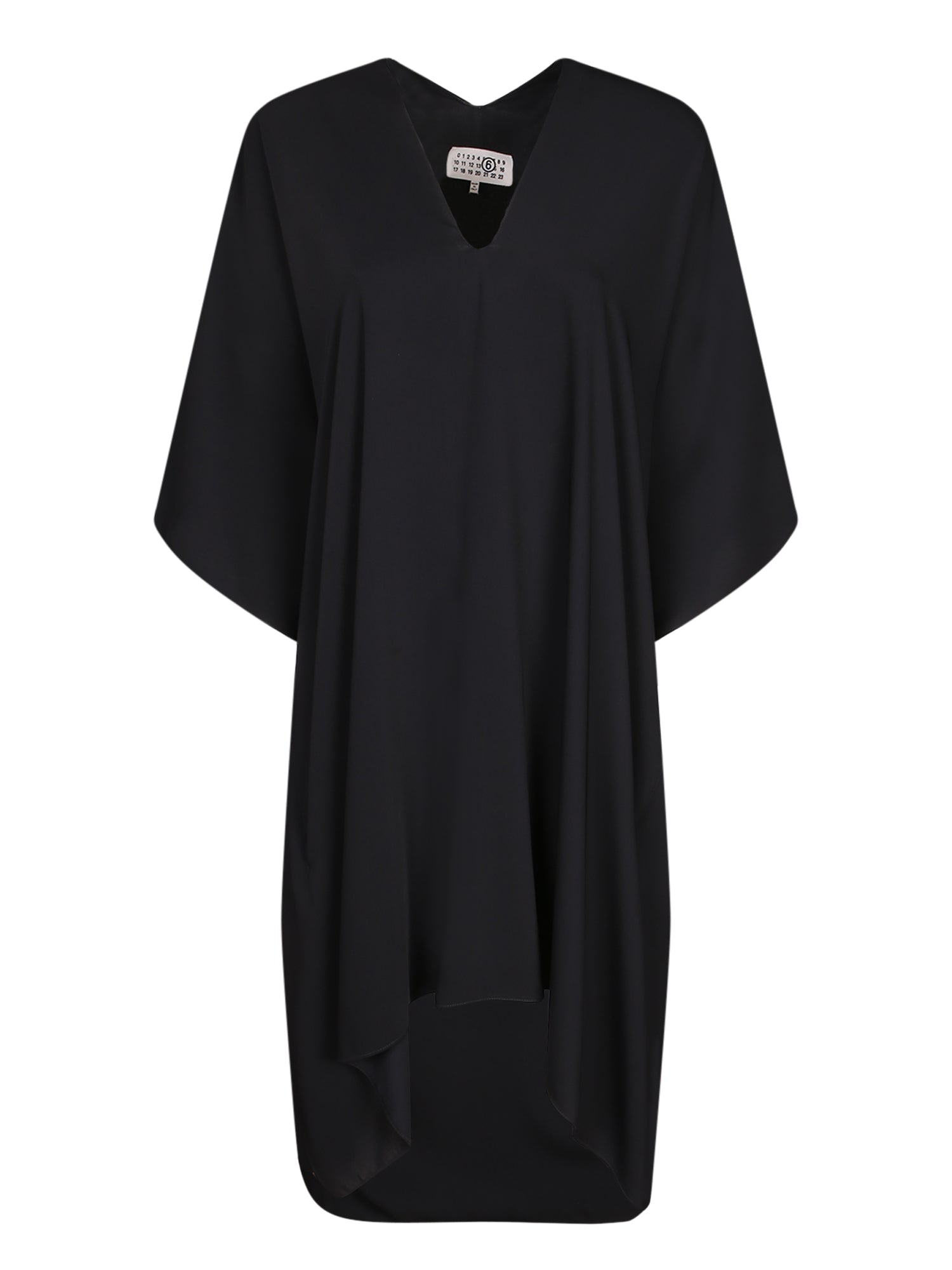 Black midi dress with a V neckline. Wide kimono sleeves. Asymmetrical cut.