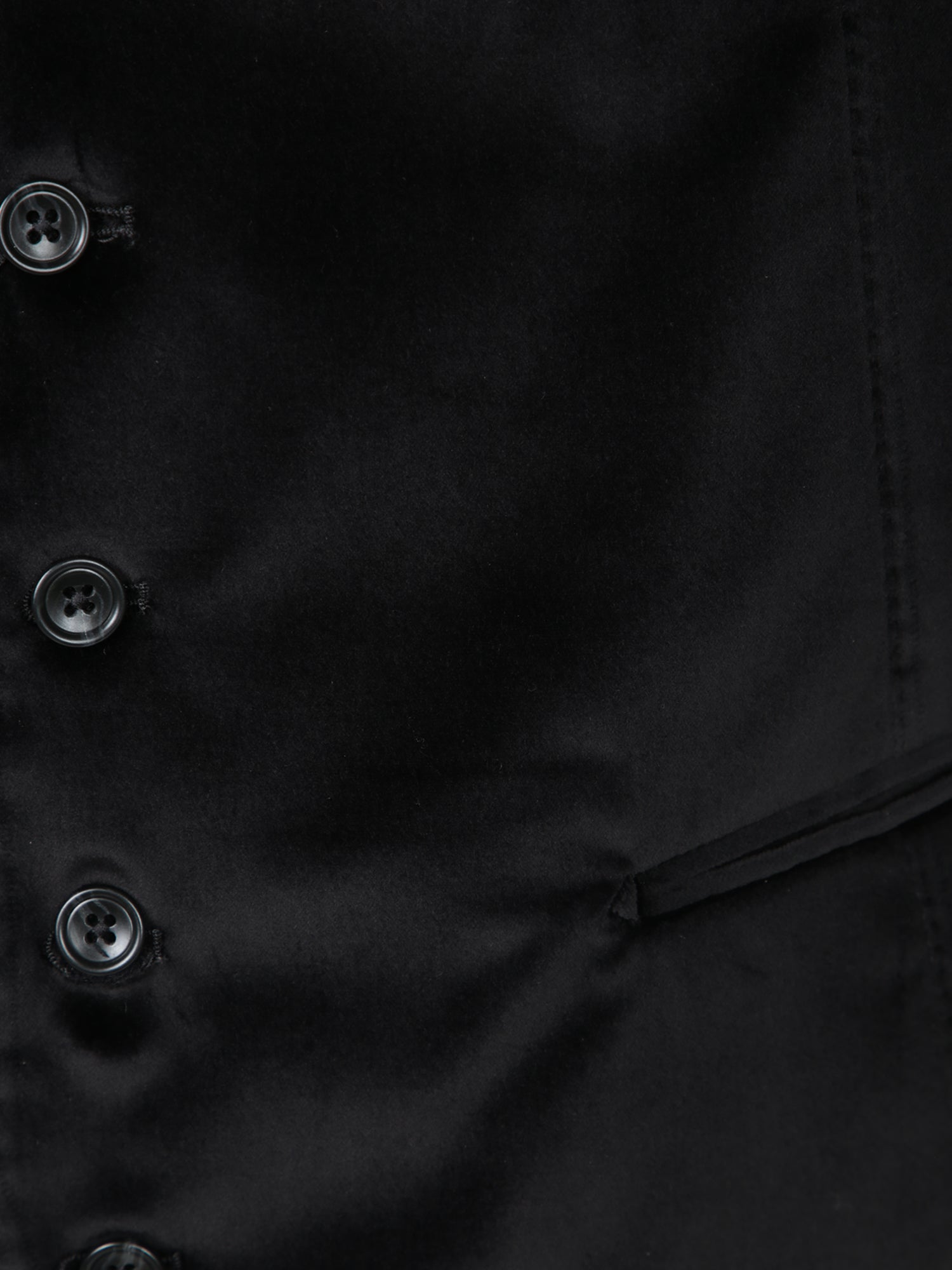 Black velvet vest with V-neck. Button front closure and chest pocket.