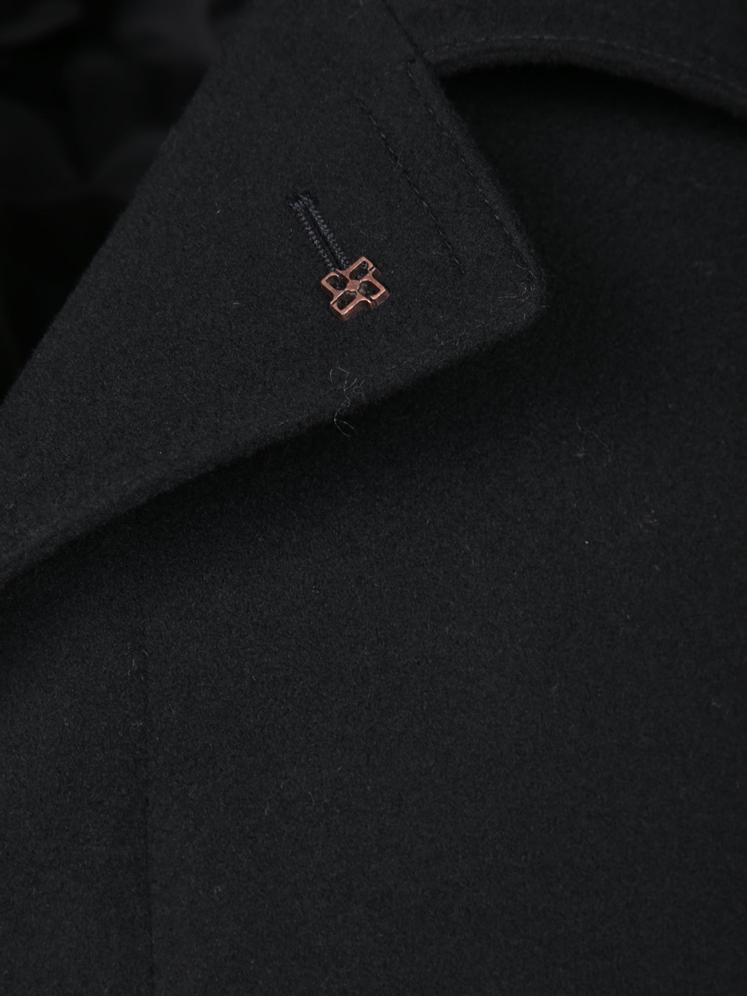 Raglan cut design. Wool and cashmere fabric. Side welt pockets.