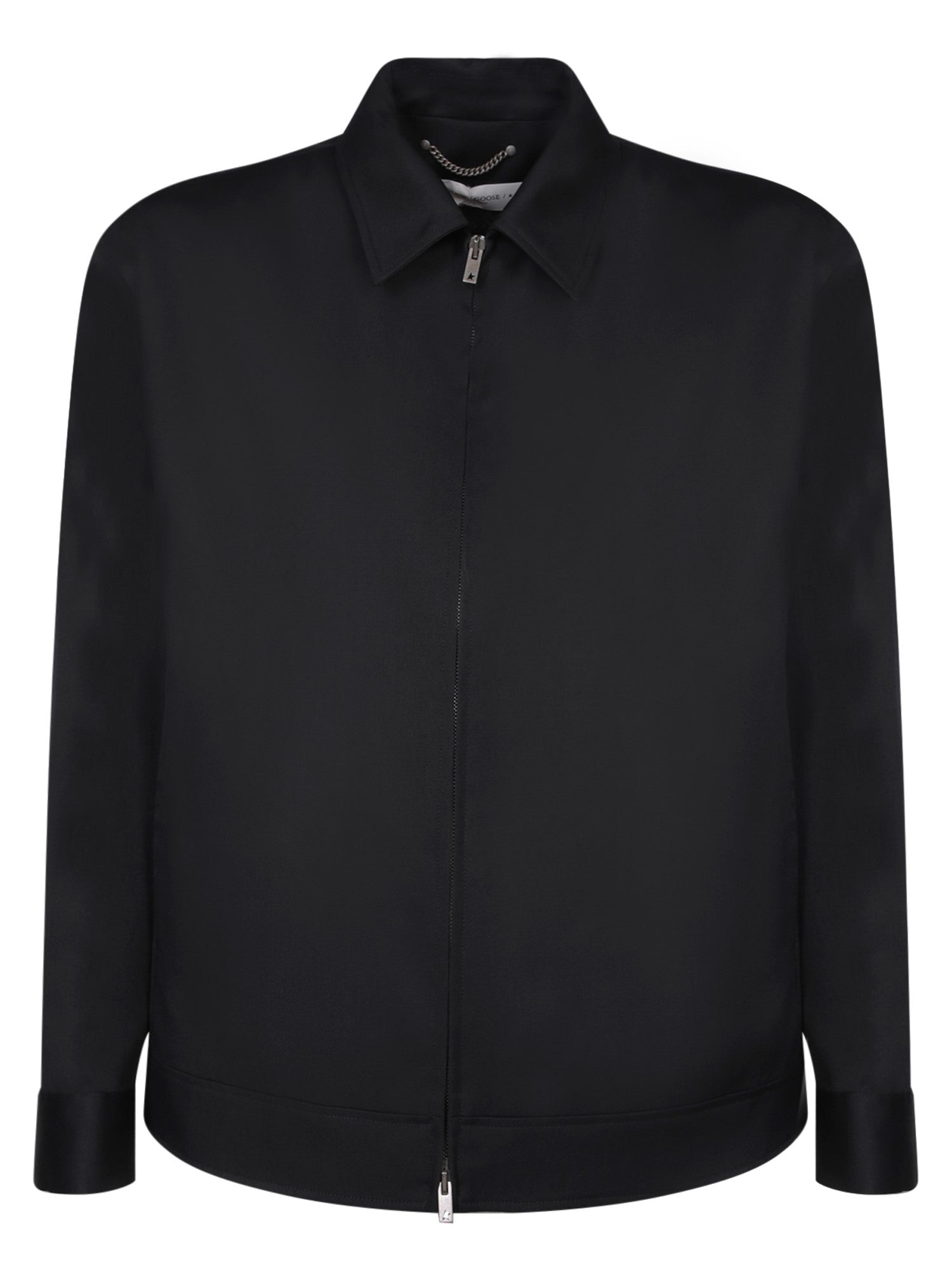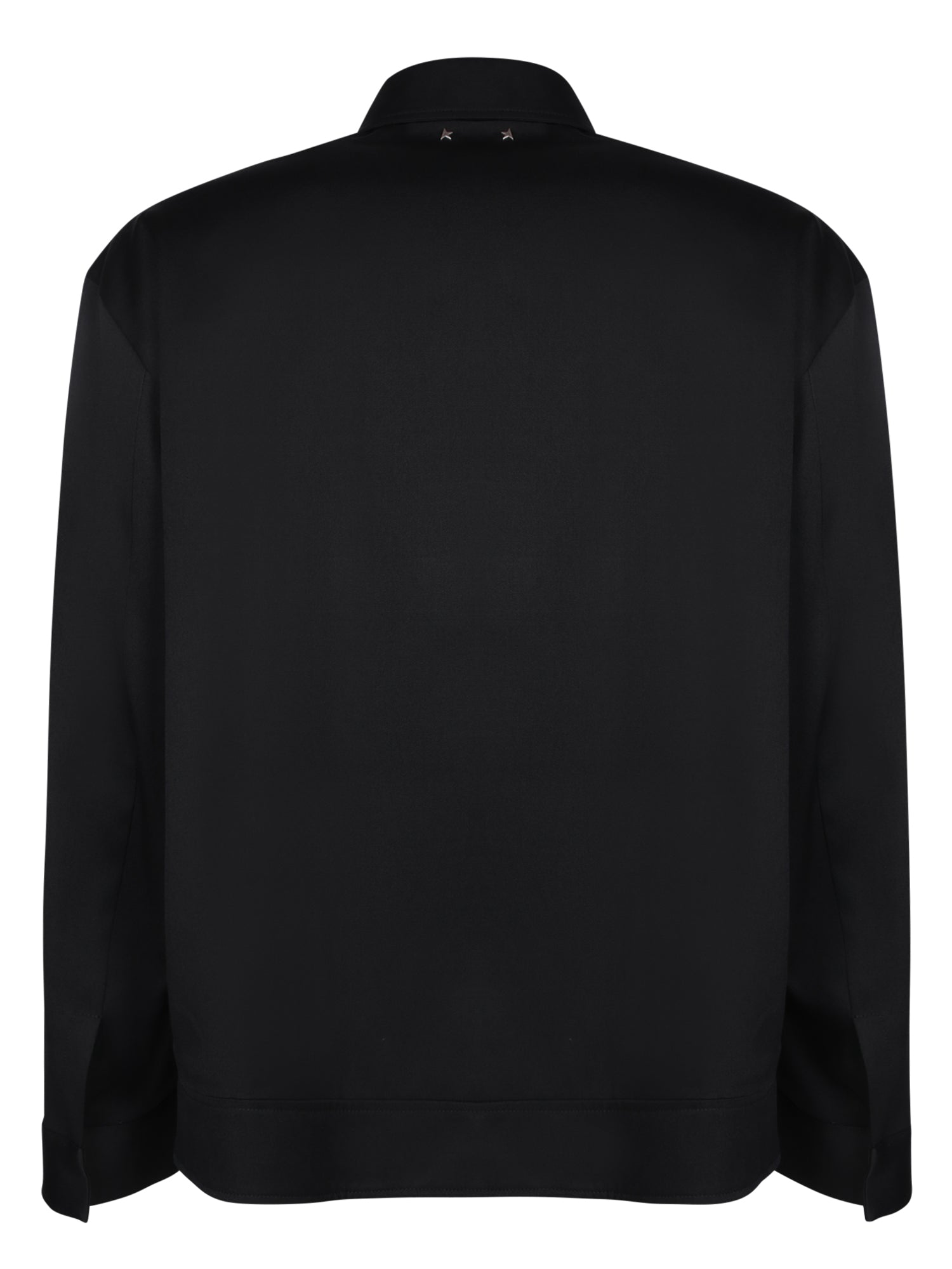Elegant black wool jacket by Golden Goose, featuring a zip closure and premium finishes such as a collar adorned with a silver chain, adding a touch of sophistication.