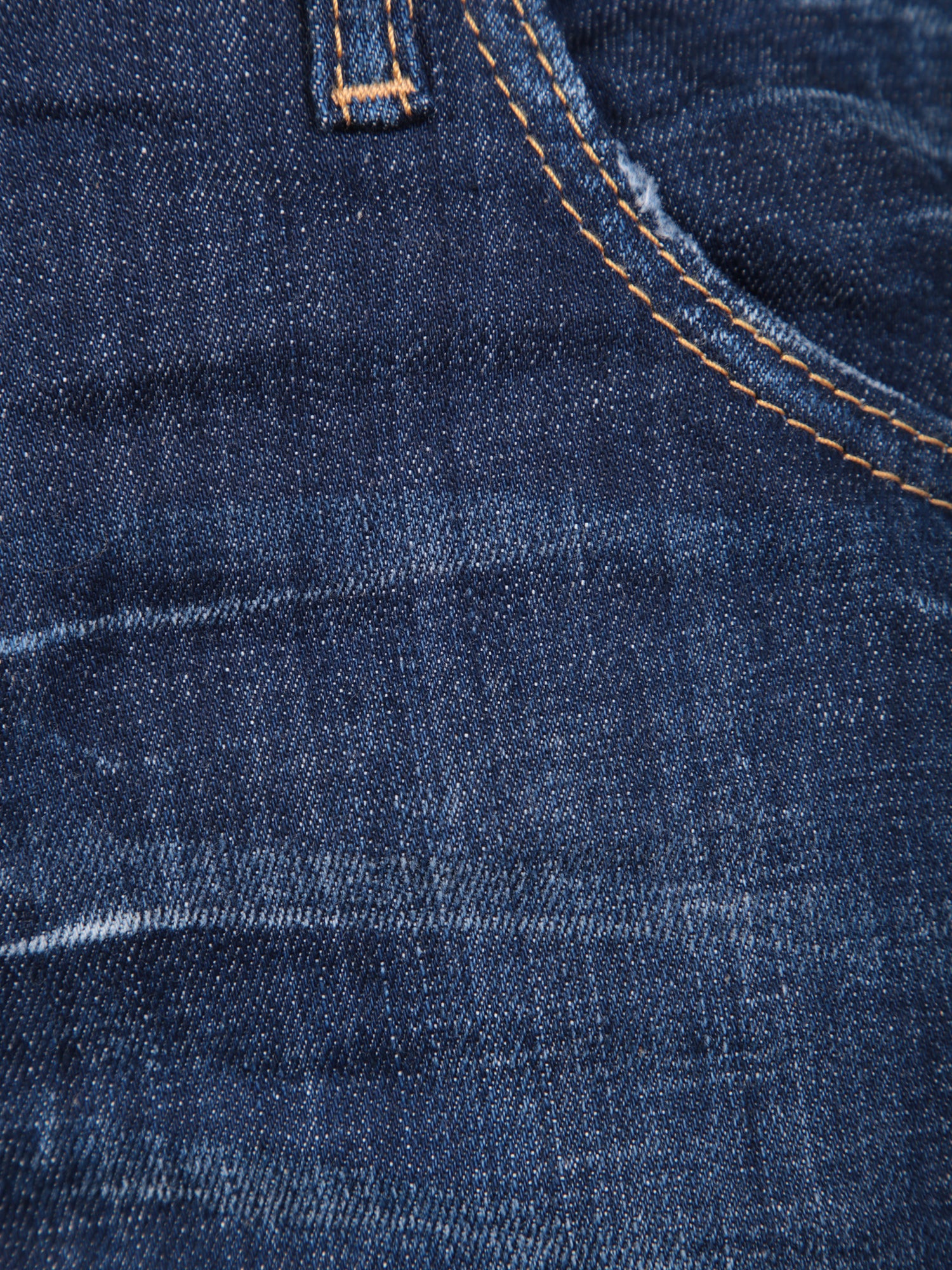 Vita media. Chiusura frontale con bottone e zip. Passanti. Classiche cinque tasche. Targhetta con logo frontale. Logo applicato sul retro. Effetto candeggina. Orlo dritto. Colore: blu