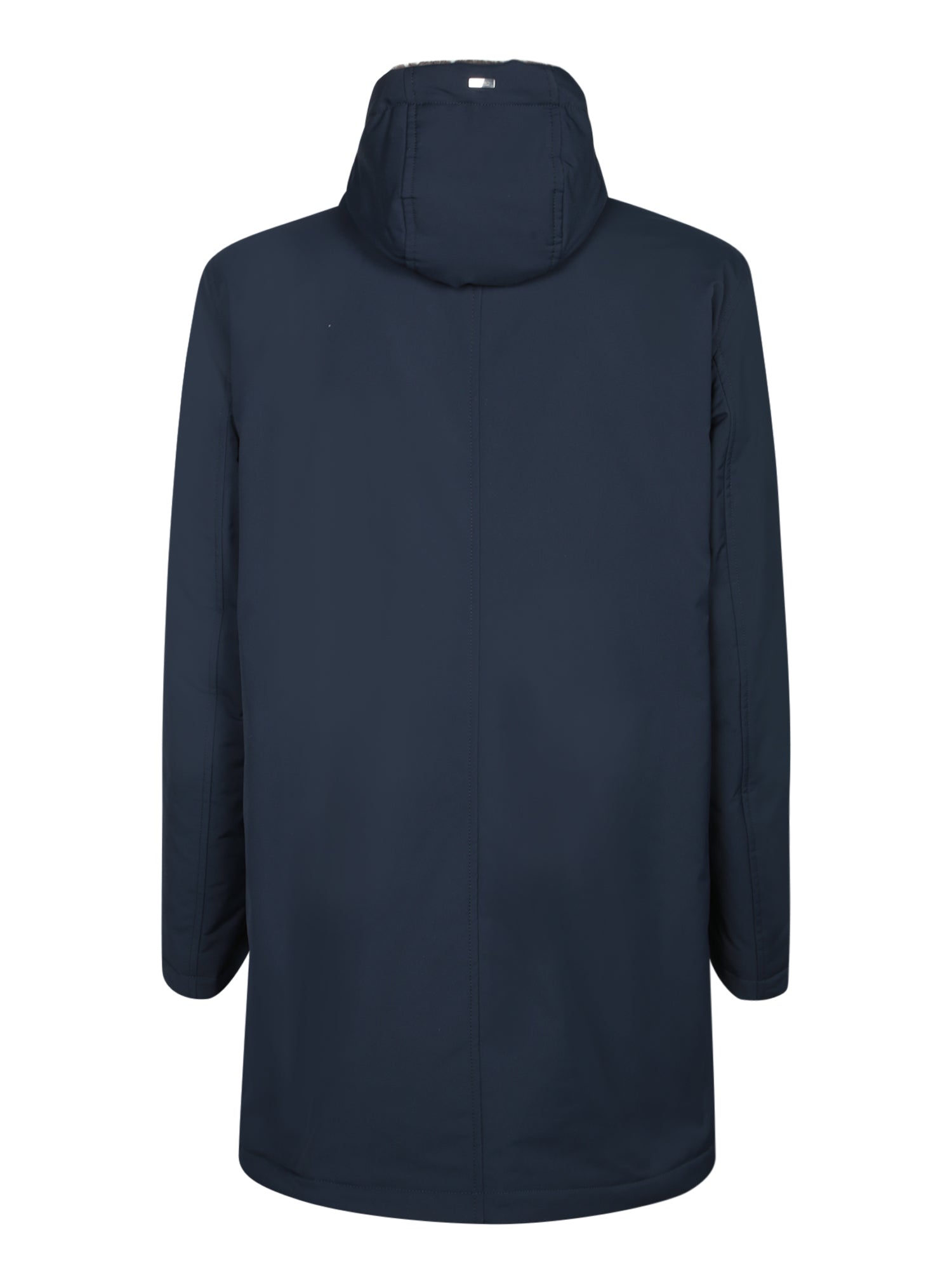 Three-quarter coat in water-resistant technical fabric with faux fur lining. Features a concealed zipper and external snap button closure.