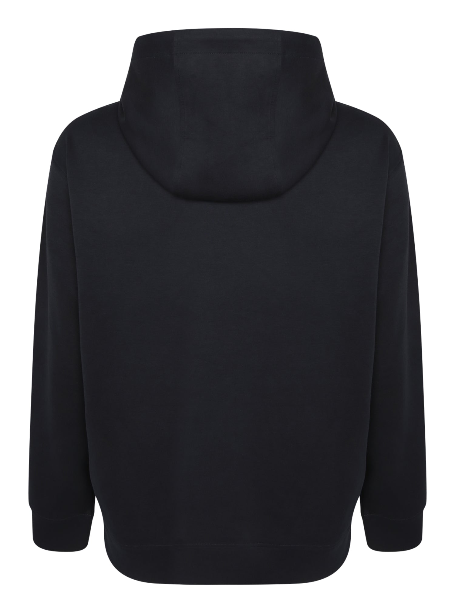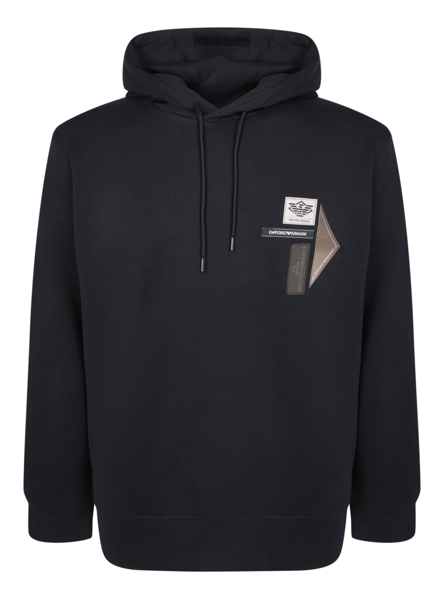 Soft fabric hoodie with a pouch pocket. Decorative label detailing on the left chest.
