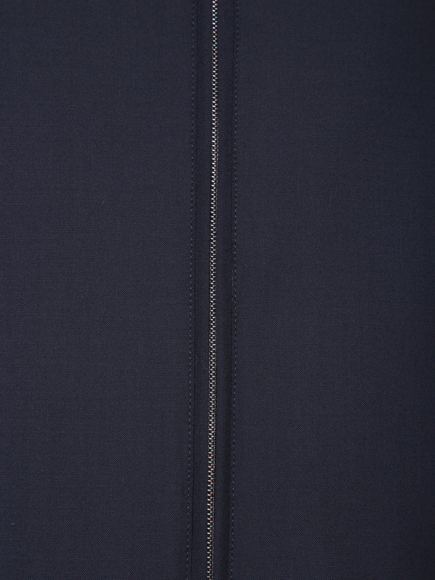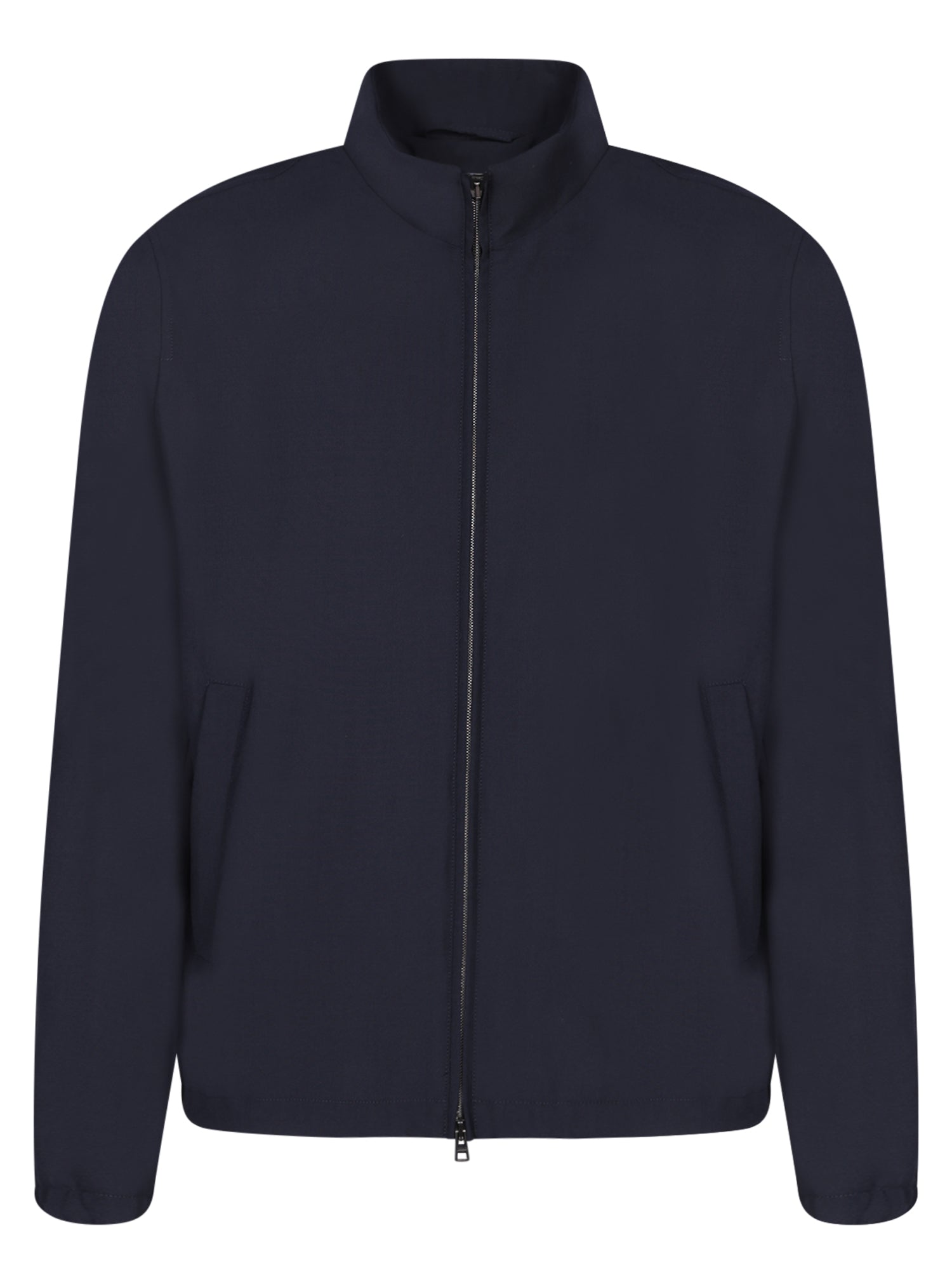 Raised collar, front zip closure, side opening pockets.