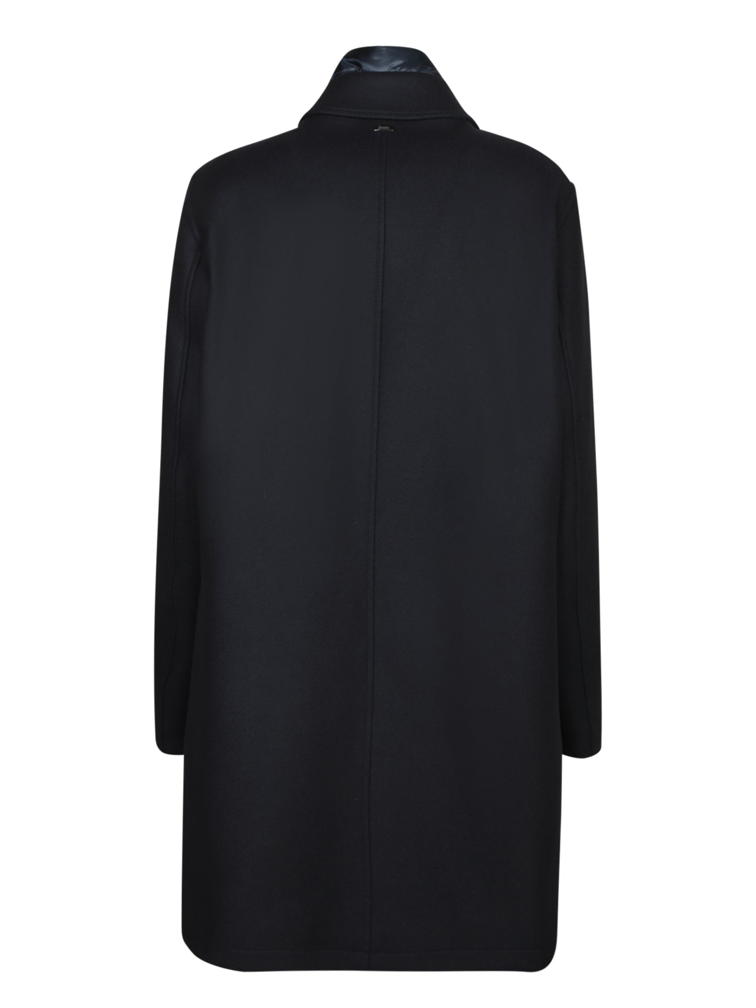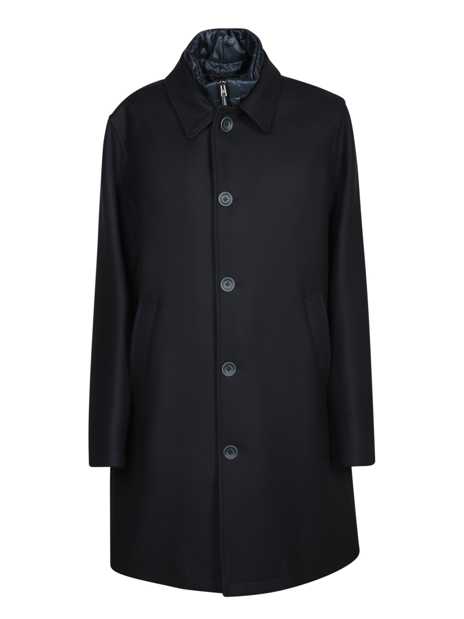 Blue coat with classic collar. Front button closure. Quilted inner lining.