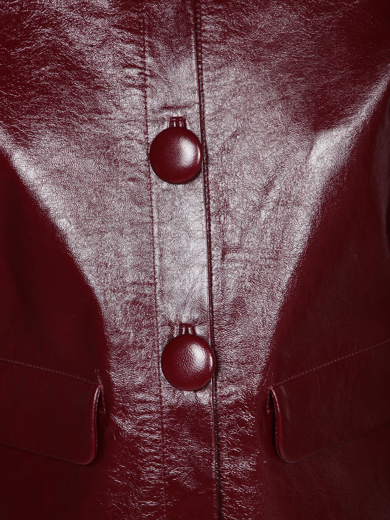 Smooth leather jacket with button closure. Classic collar and flap pockets.
