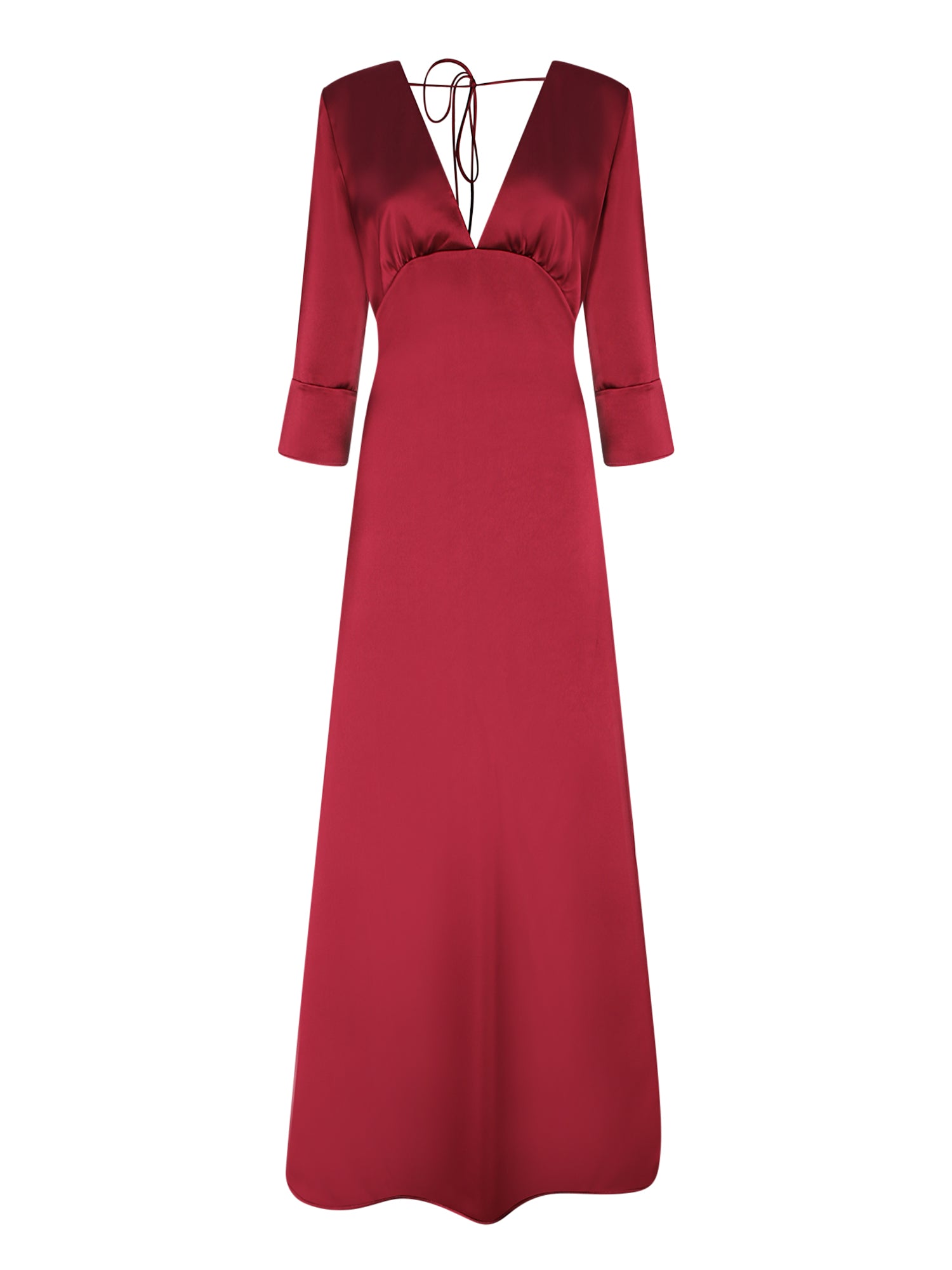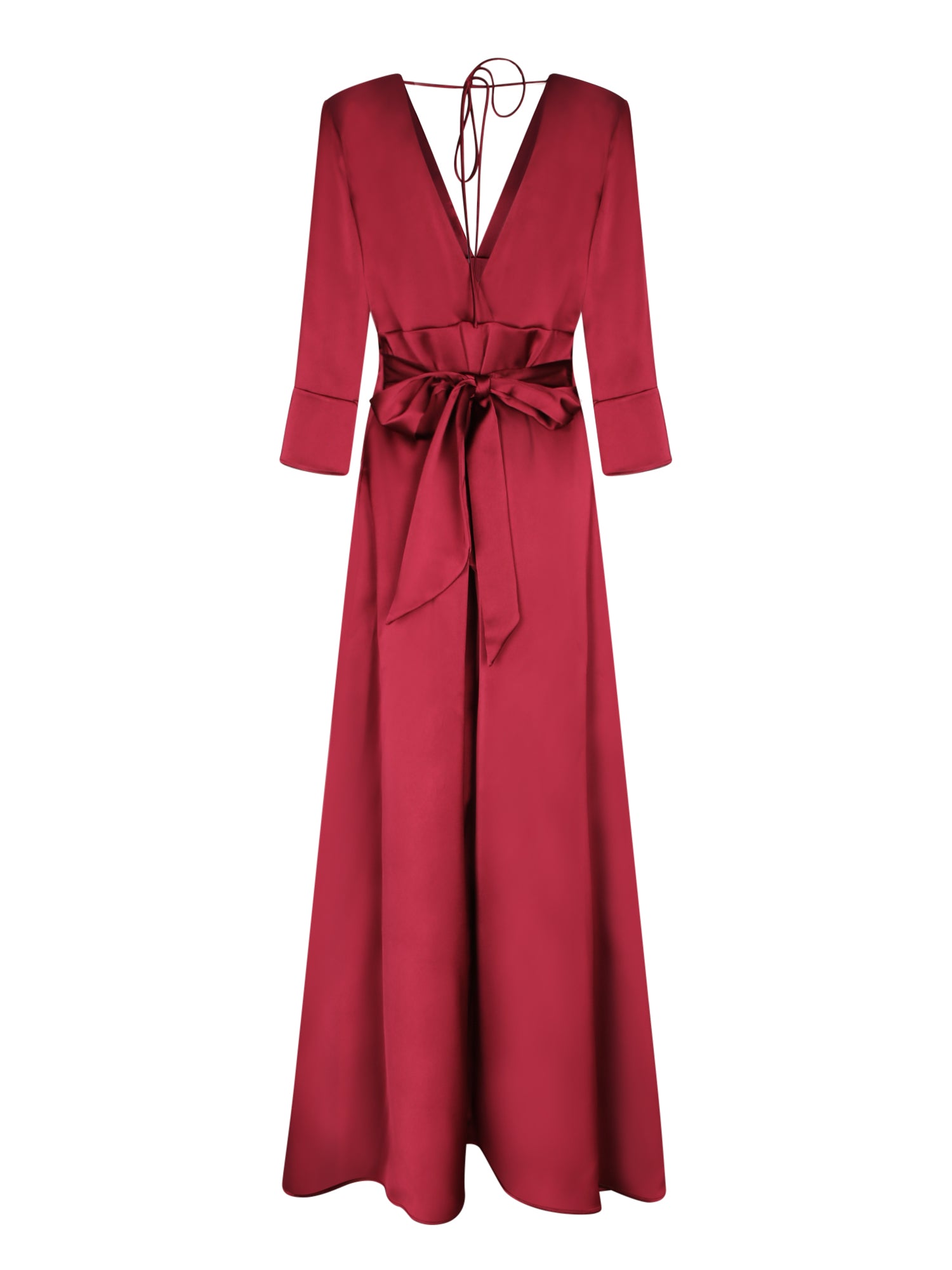 Three-quarter sleeves, deep V-neckline, bow detail on the back.