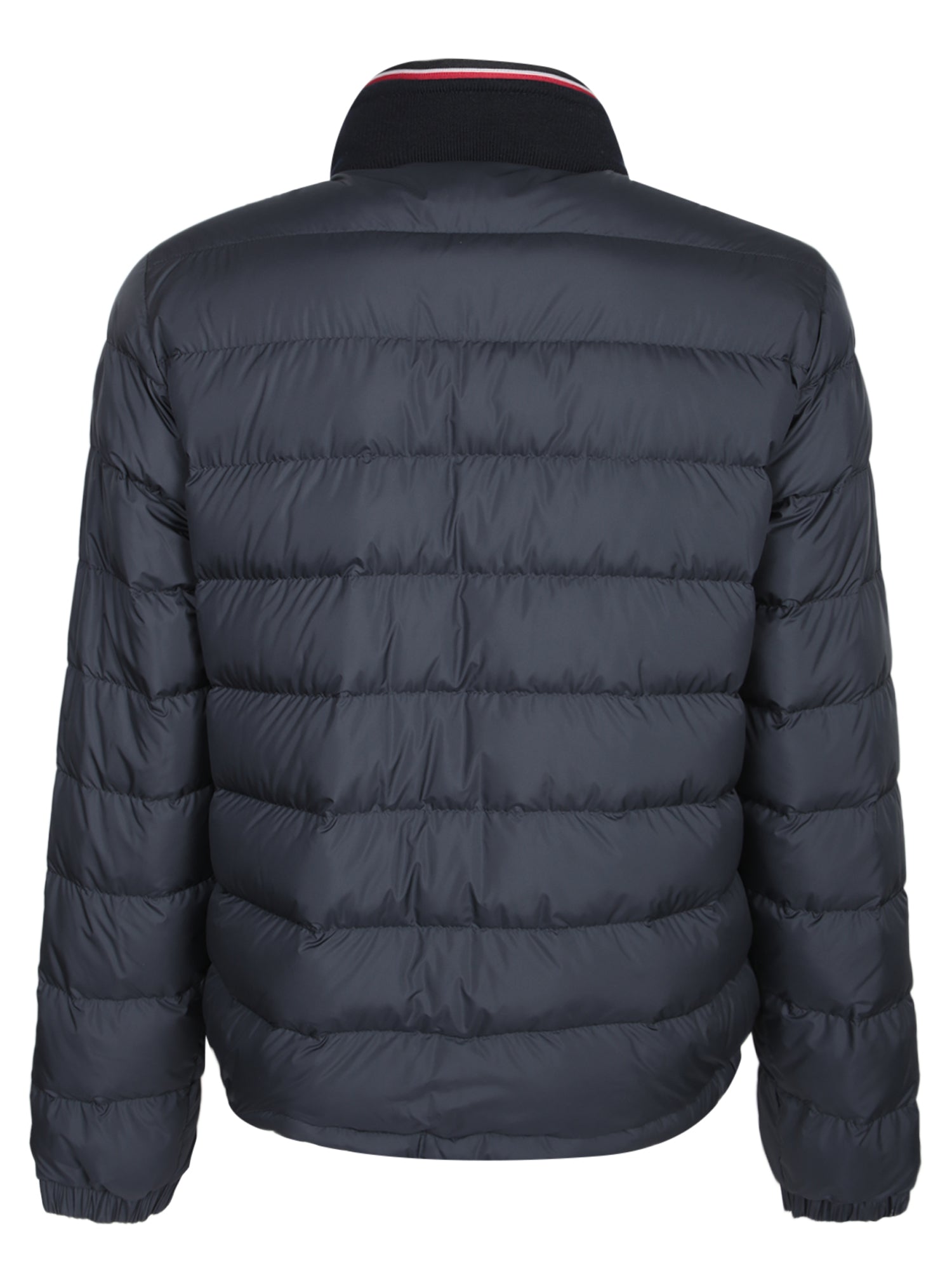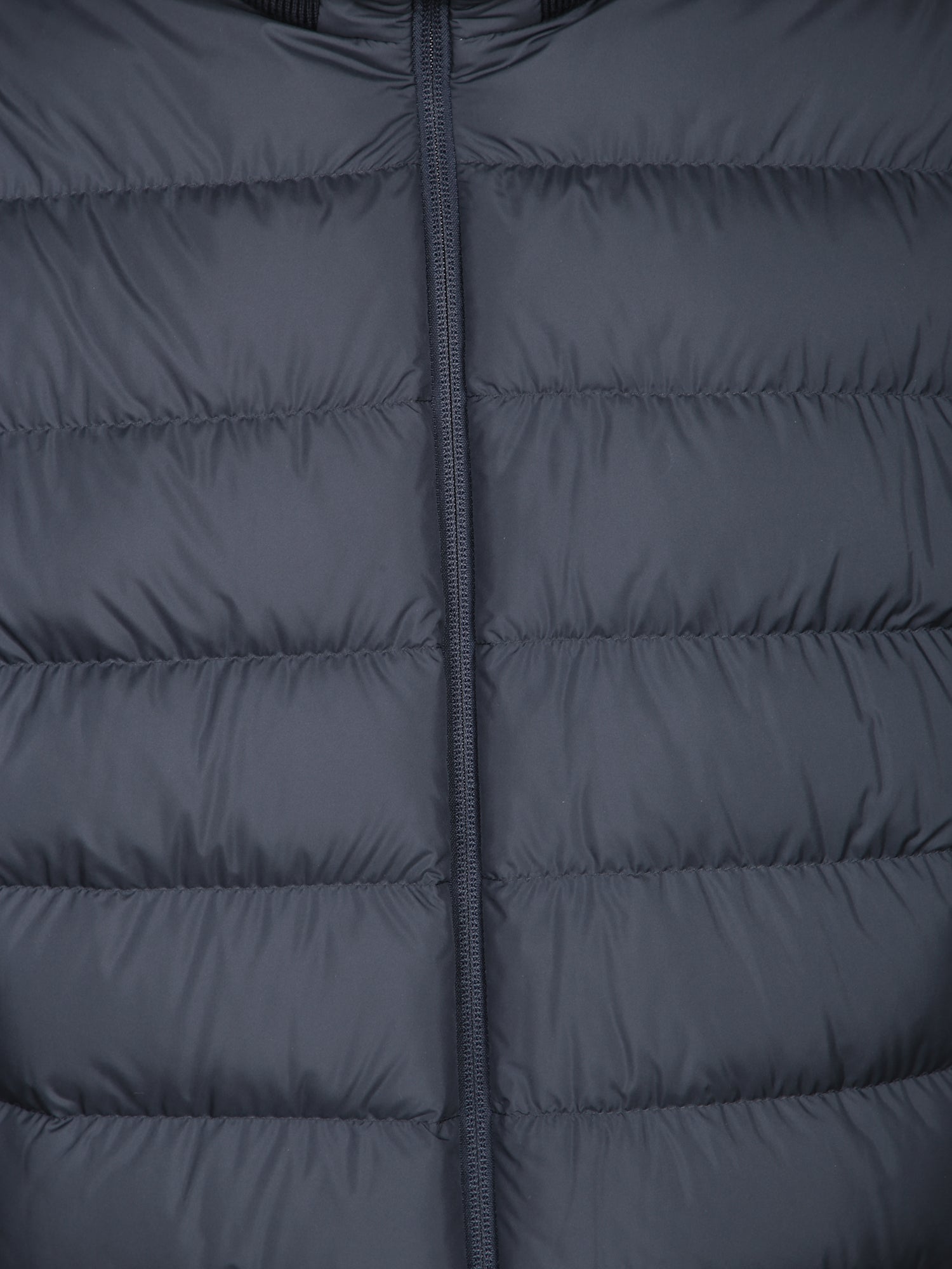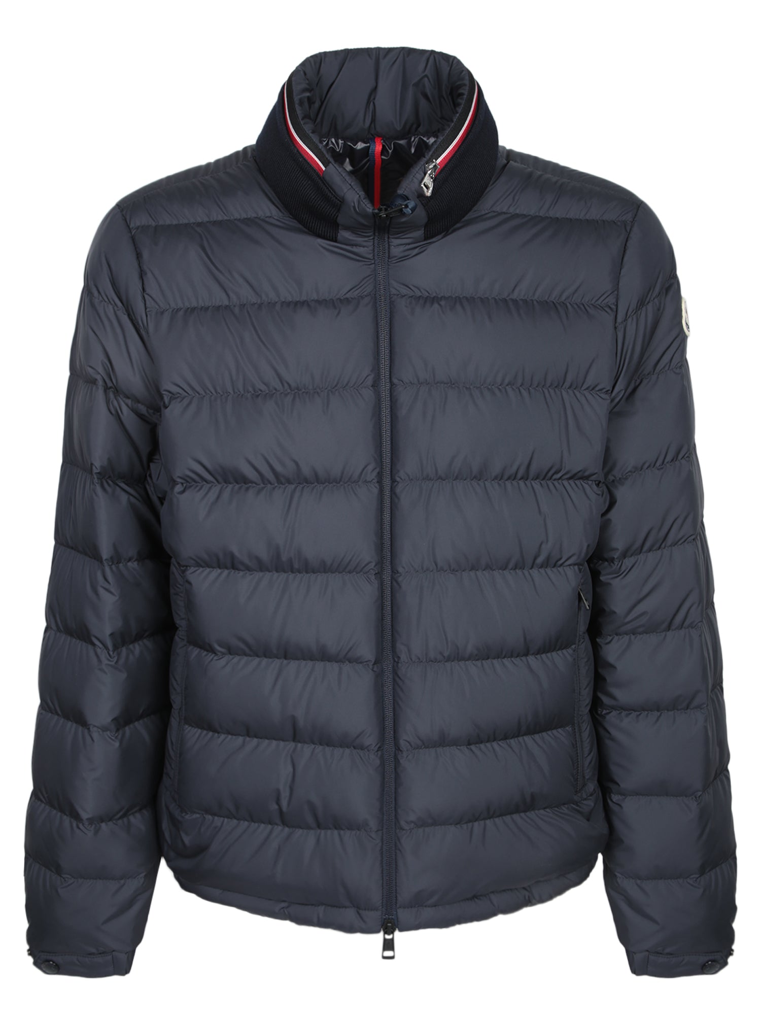Down jacket with front zip closure. High collar. Long sleeves with logo patch on the left arm.