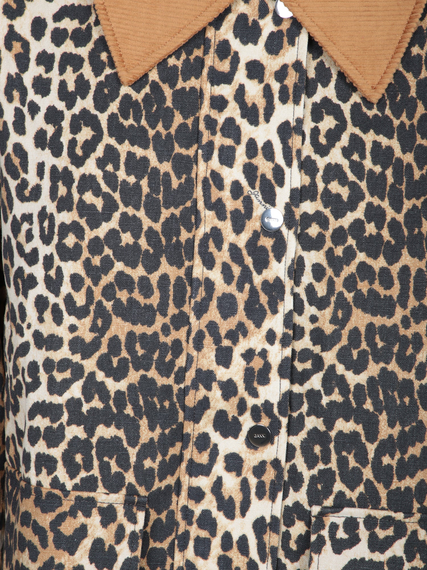 Explore a bold look with GANNI's leopard print jacket. Featuring an elegant contrasting brown collar and a relaxed silhouette, this piece promises style and comfort for any occasion.