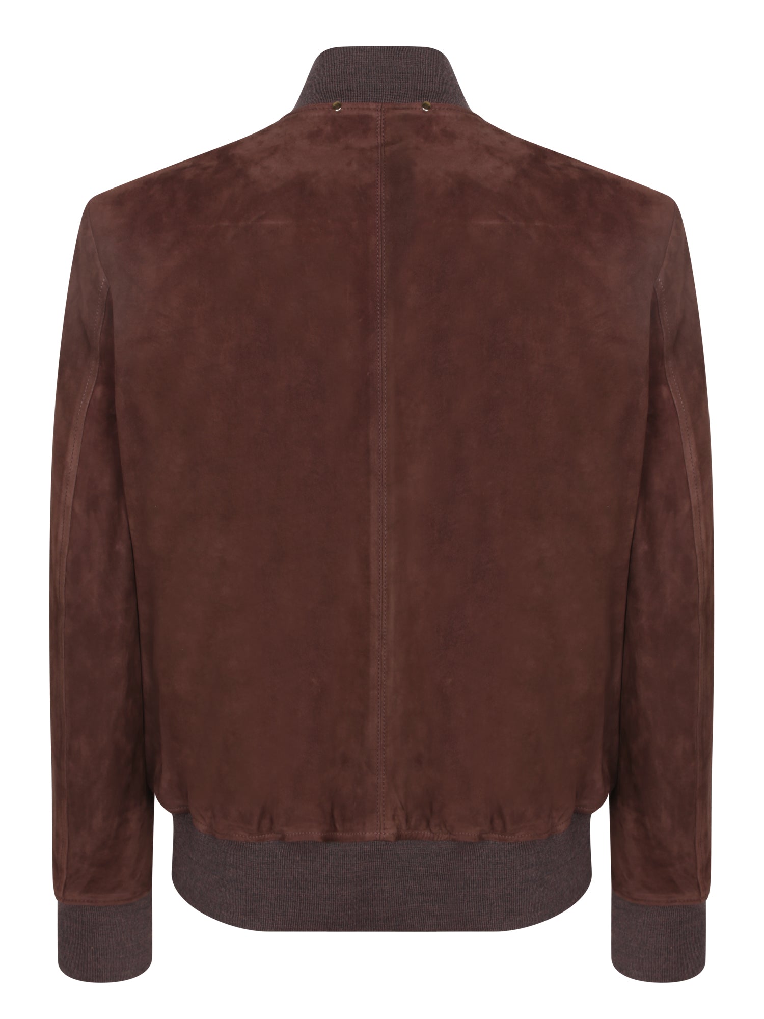 Bomber jacket crafted from soft dark brown suede. Features a zip closure, knitted collar, cuffs, and hem. Side pockets with zip.