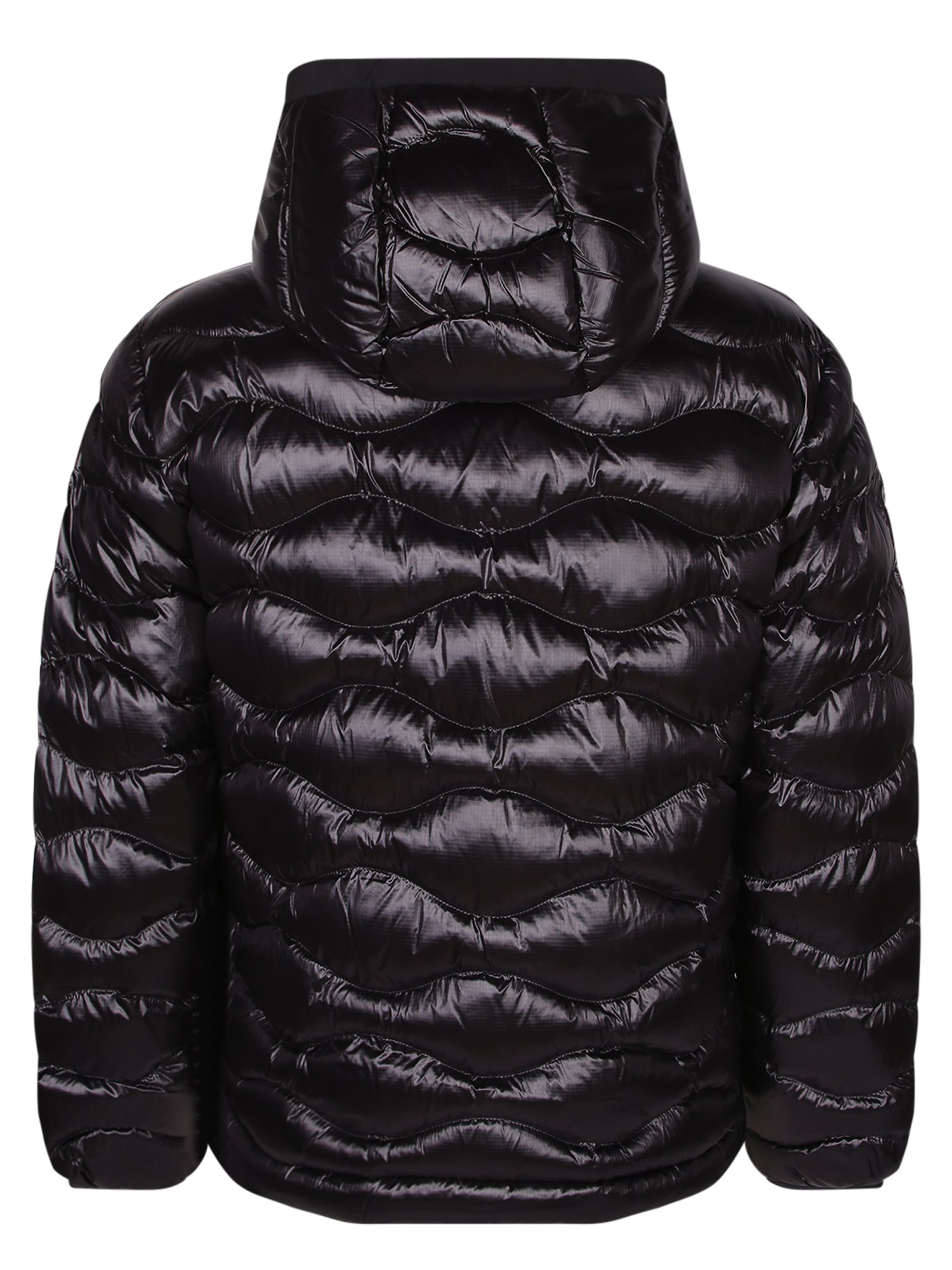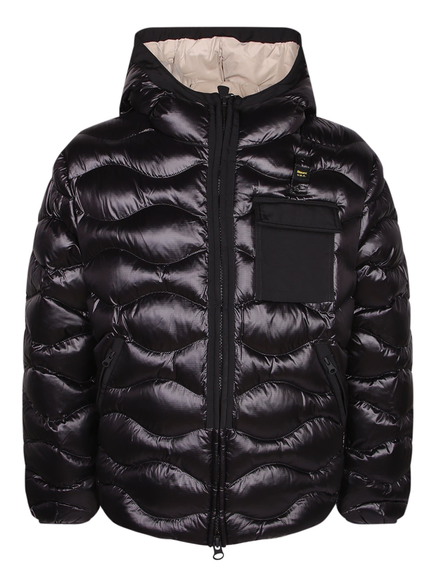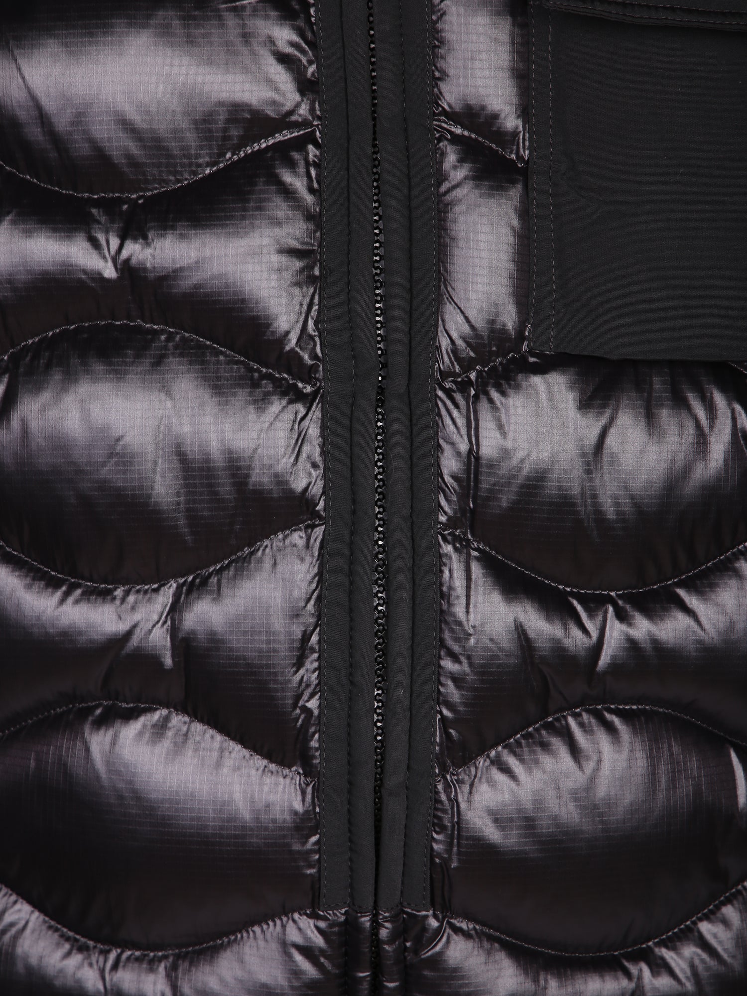 Padded down jacket, integrated hood, front zipper, and chest pocket.