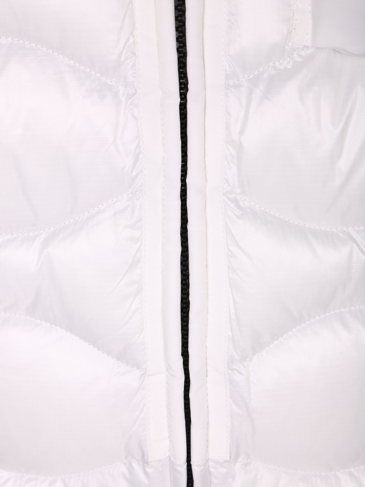 Down jacket with hood, front zip closure, and side zip pockets. Chest pocket detail.