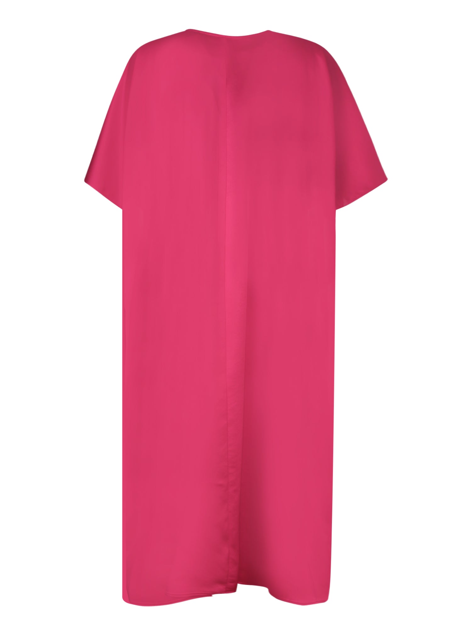 Kaftan dress with V-neckline. Wide short sleeves. Midi length. Cherry satin fabric.