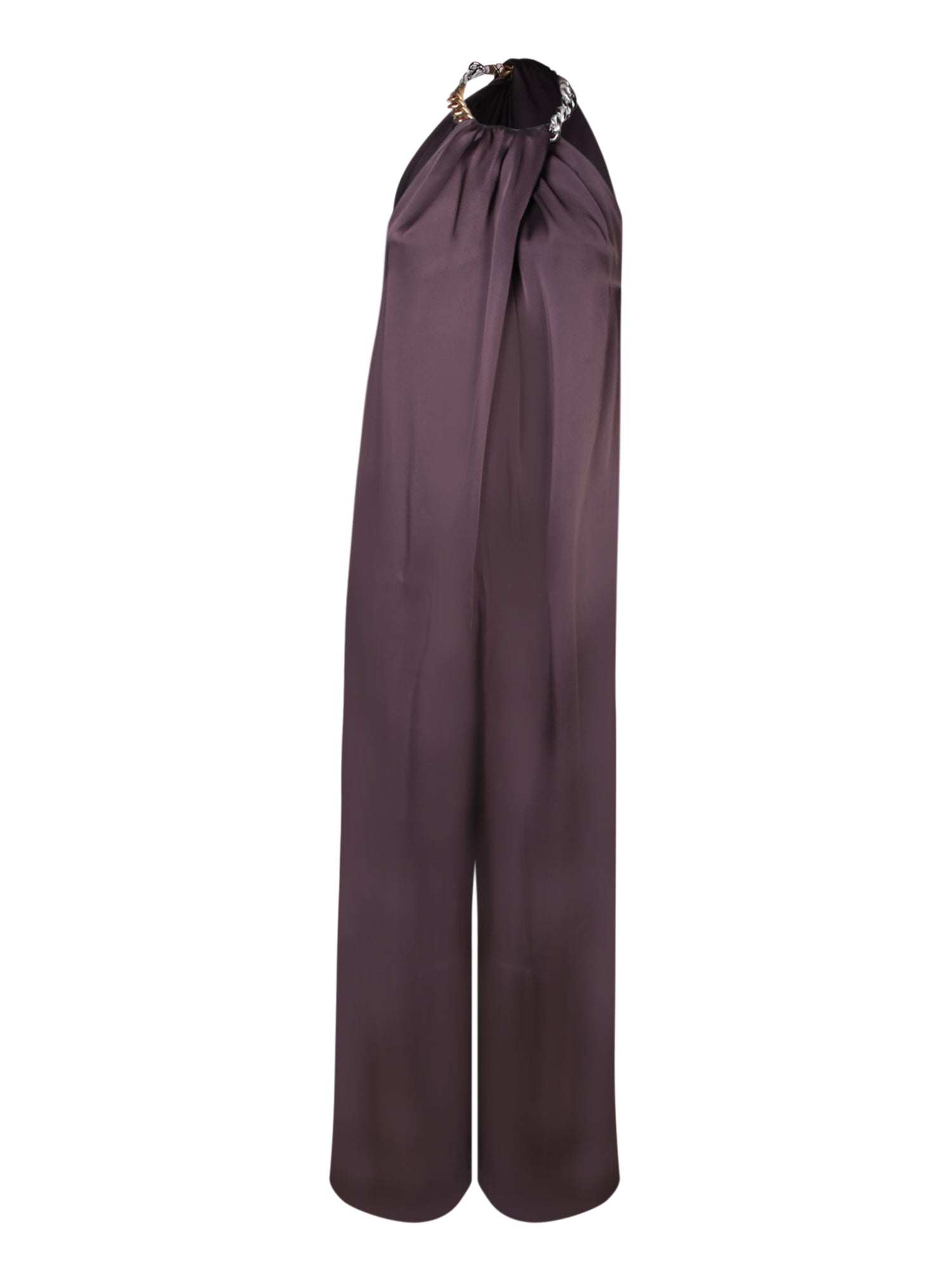 Sleeveless jumpsuit. Silver chain detailing at the neck. Satin fabric.