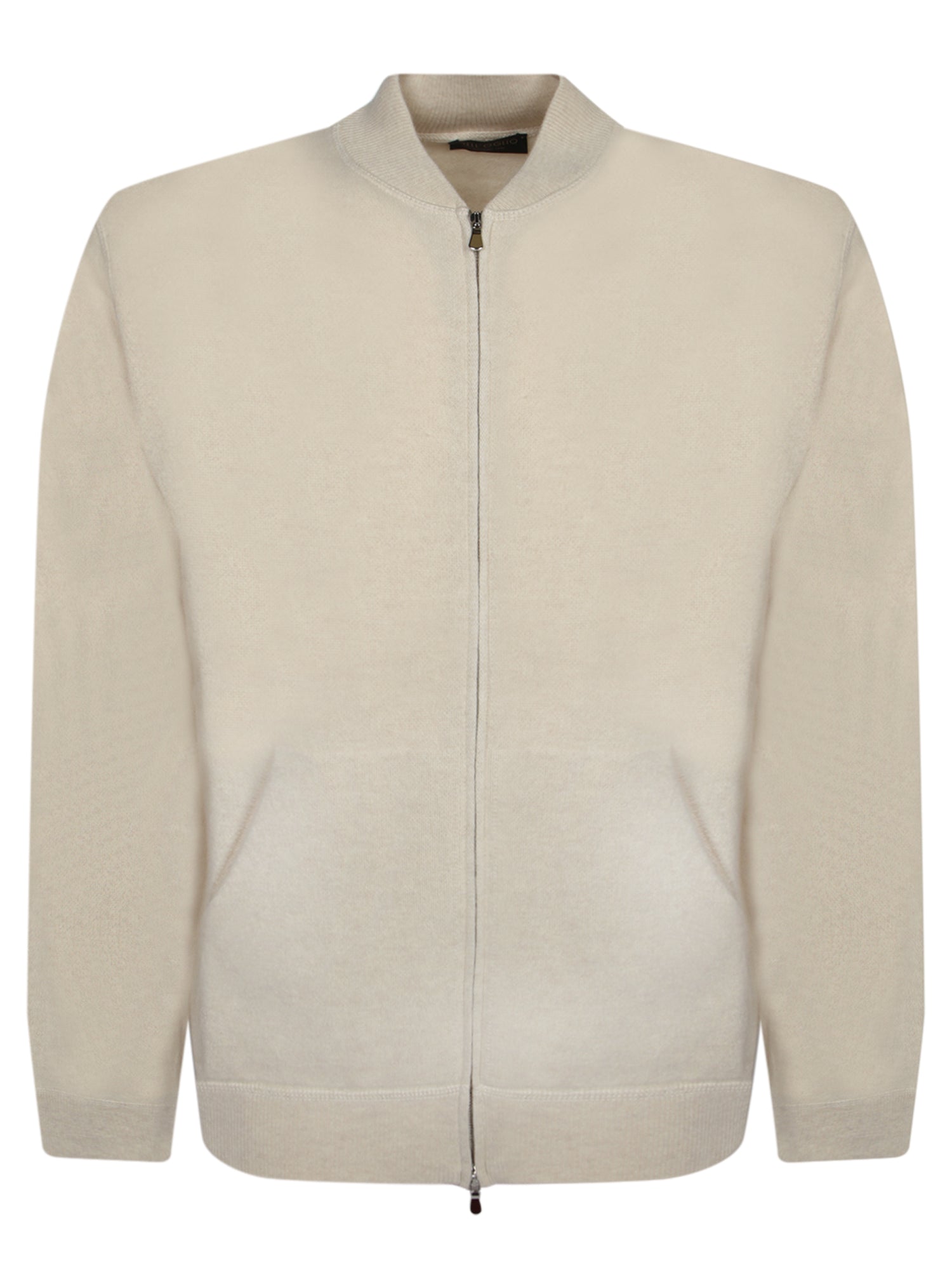 Bomber cardigan in textured fabric with front zipper. Ribbed collar, cuffs, and hem.