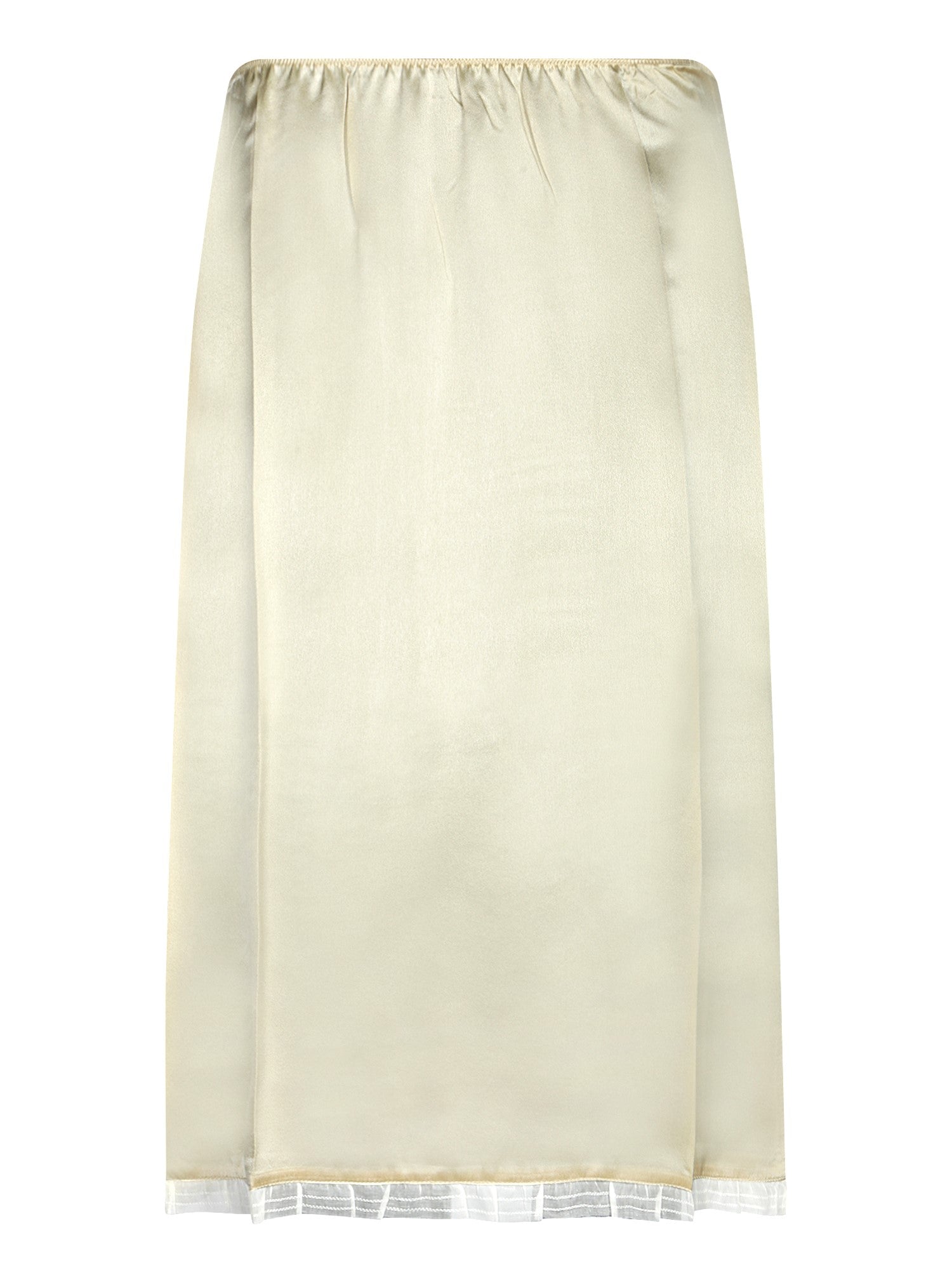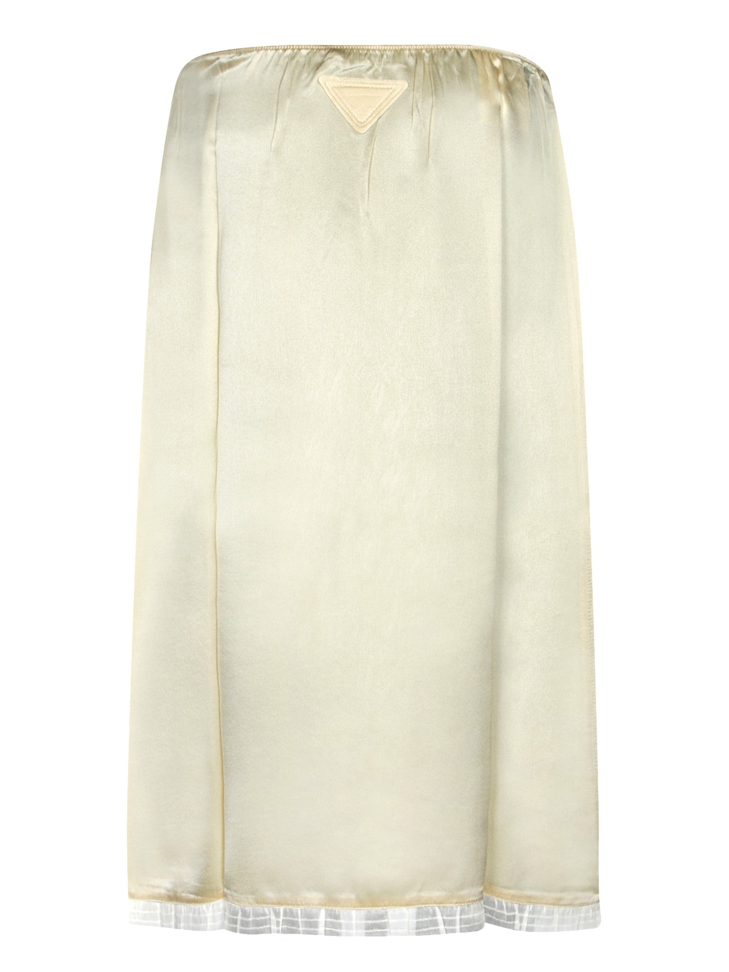 This elegant Prada midi skirt is crafted from refined cream satin crepe that drapes beautifully for a clean, flowing silhouette, featuring an elastic waistband for optimal comfort.