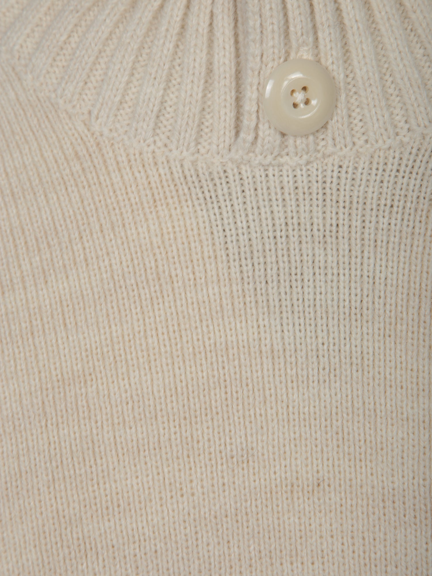 High shirt collar with button closure. Fine knit fabric in cream shade. Ribbed cuffs and hem.