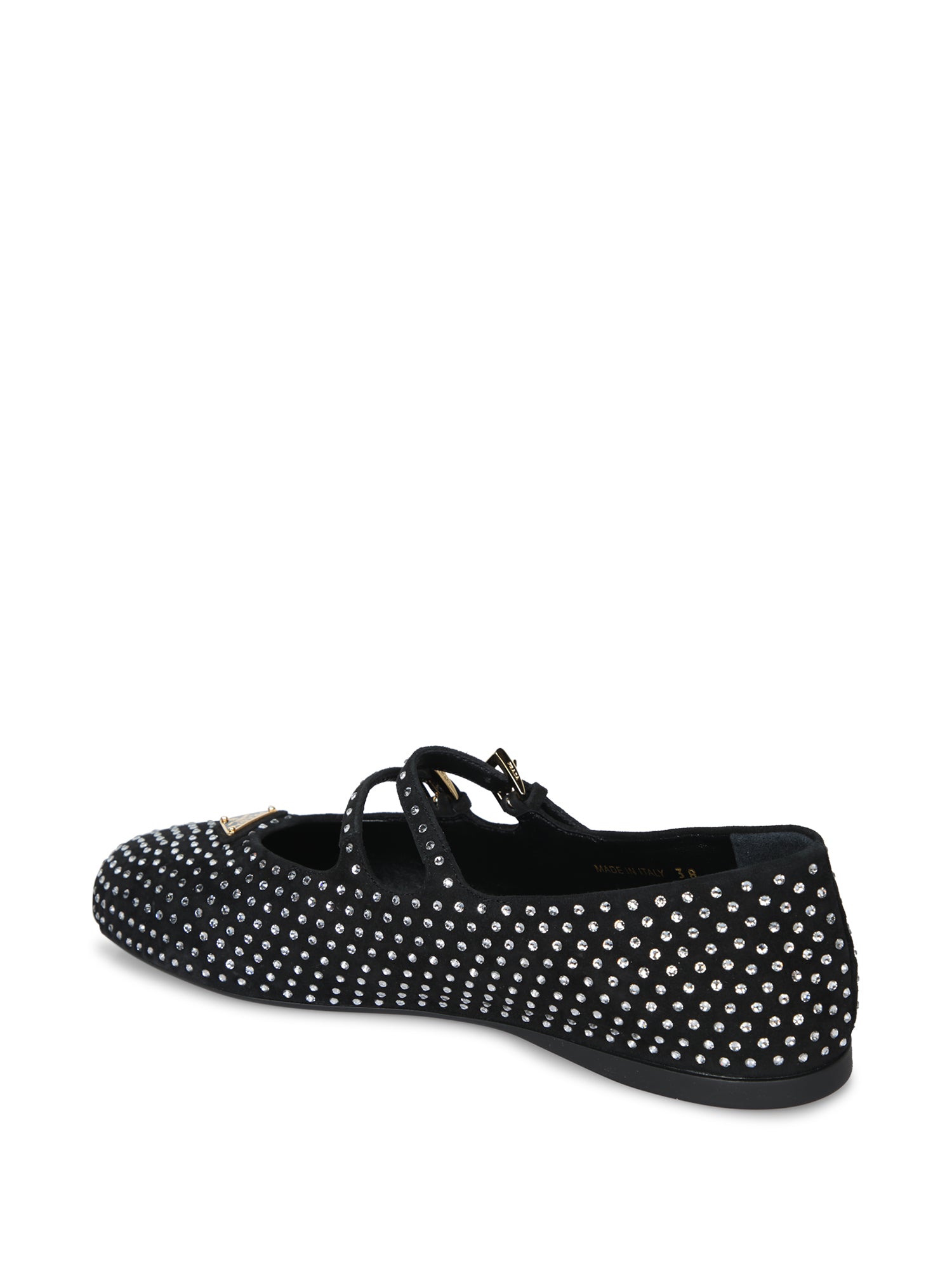 Black velvet ballerinas, embellished with crystals. Features double gold buckle at the front.