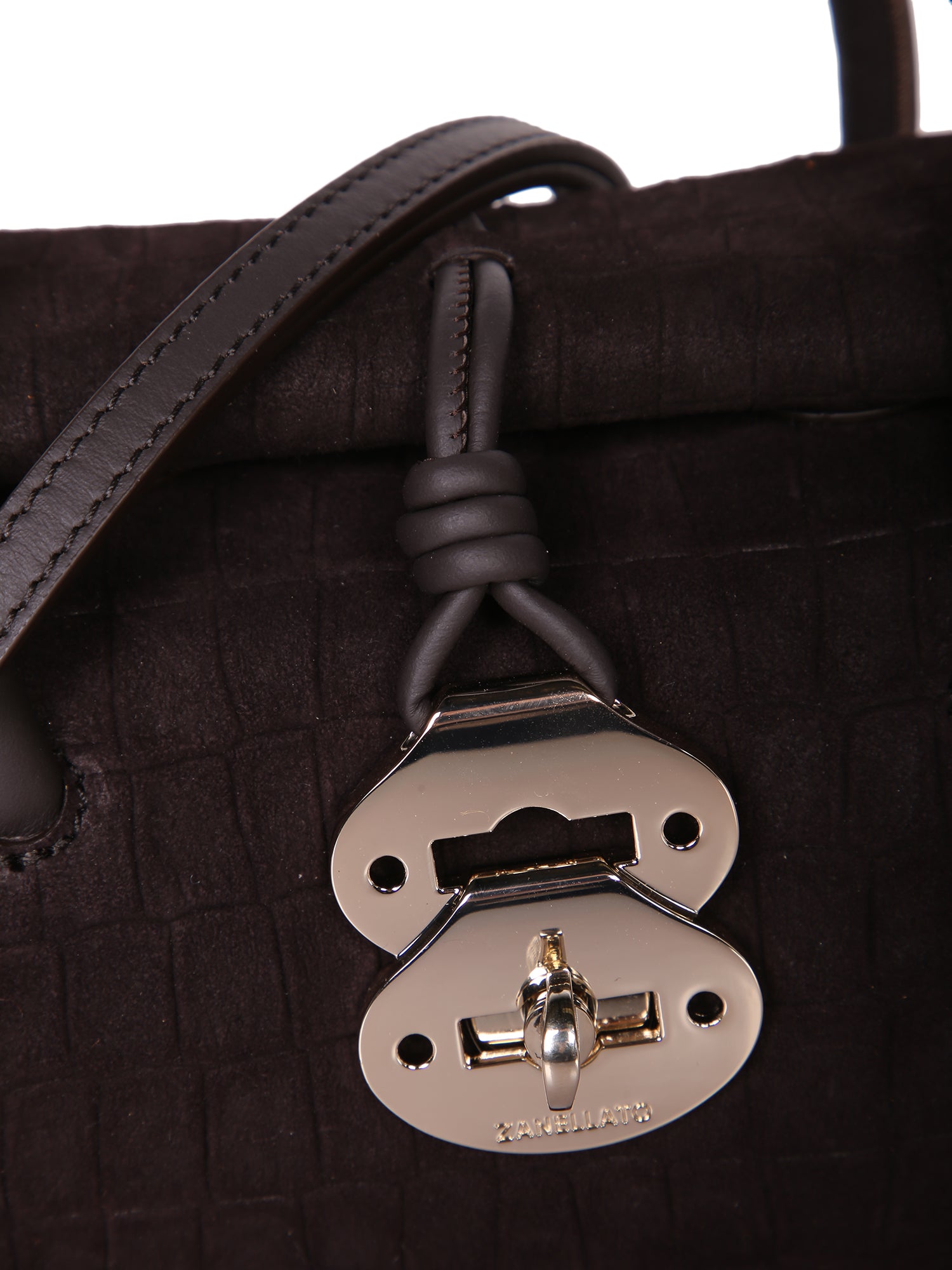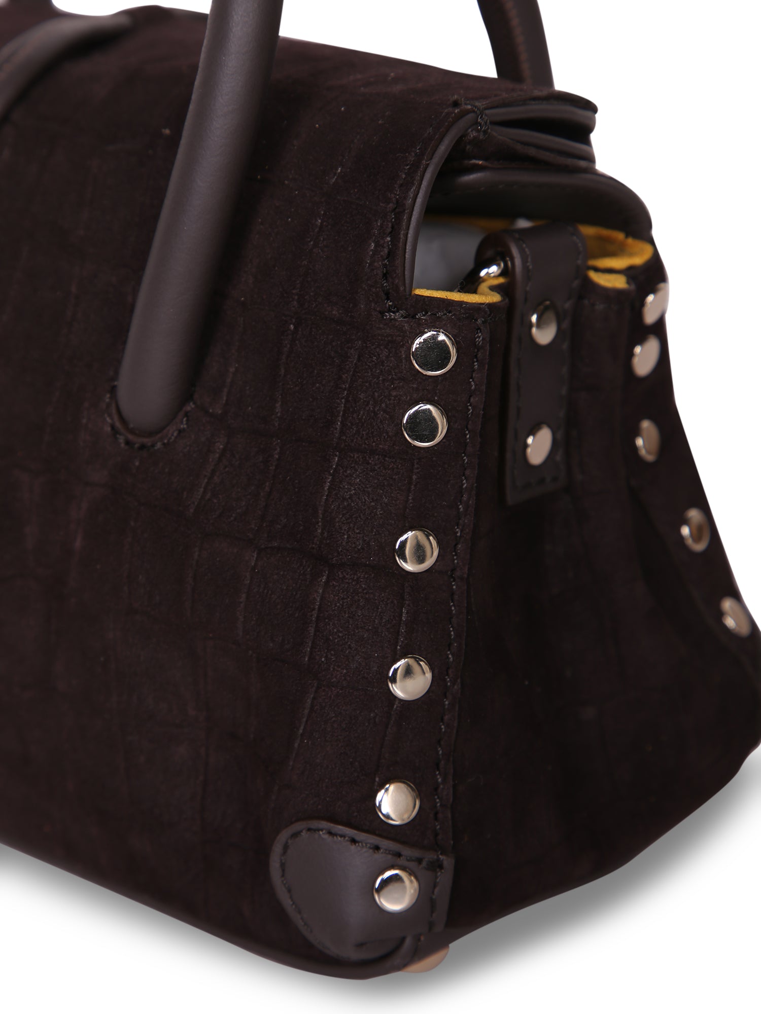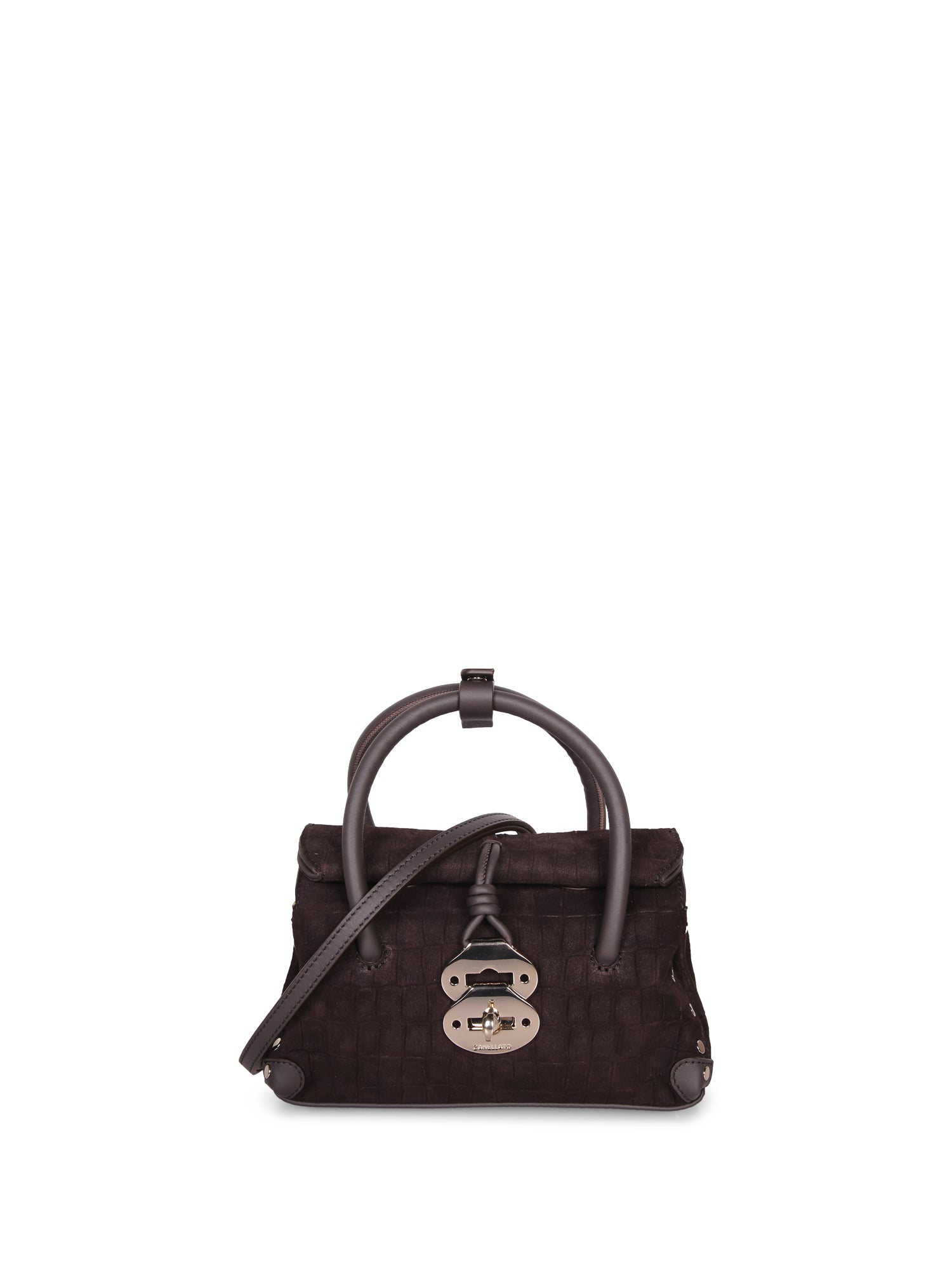 Crafted from crocodile-effect printed suede. Features top handles and a front lock closure.